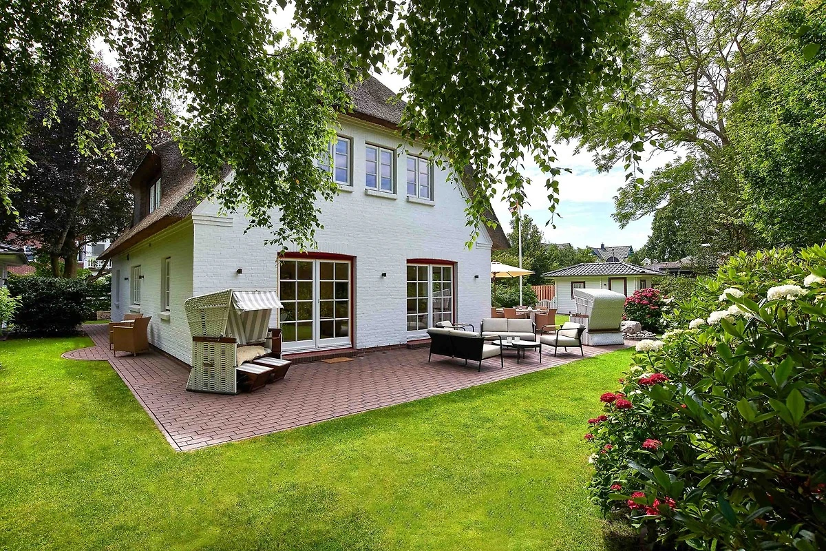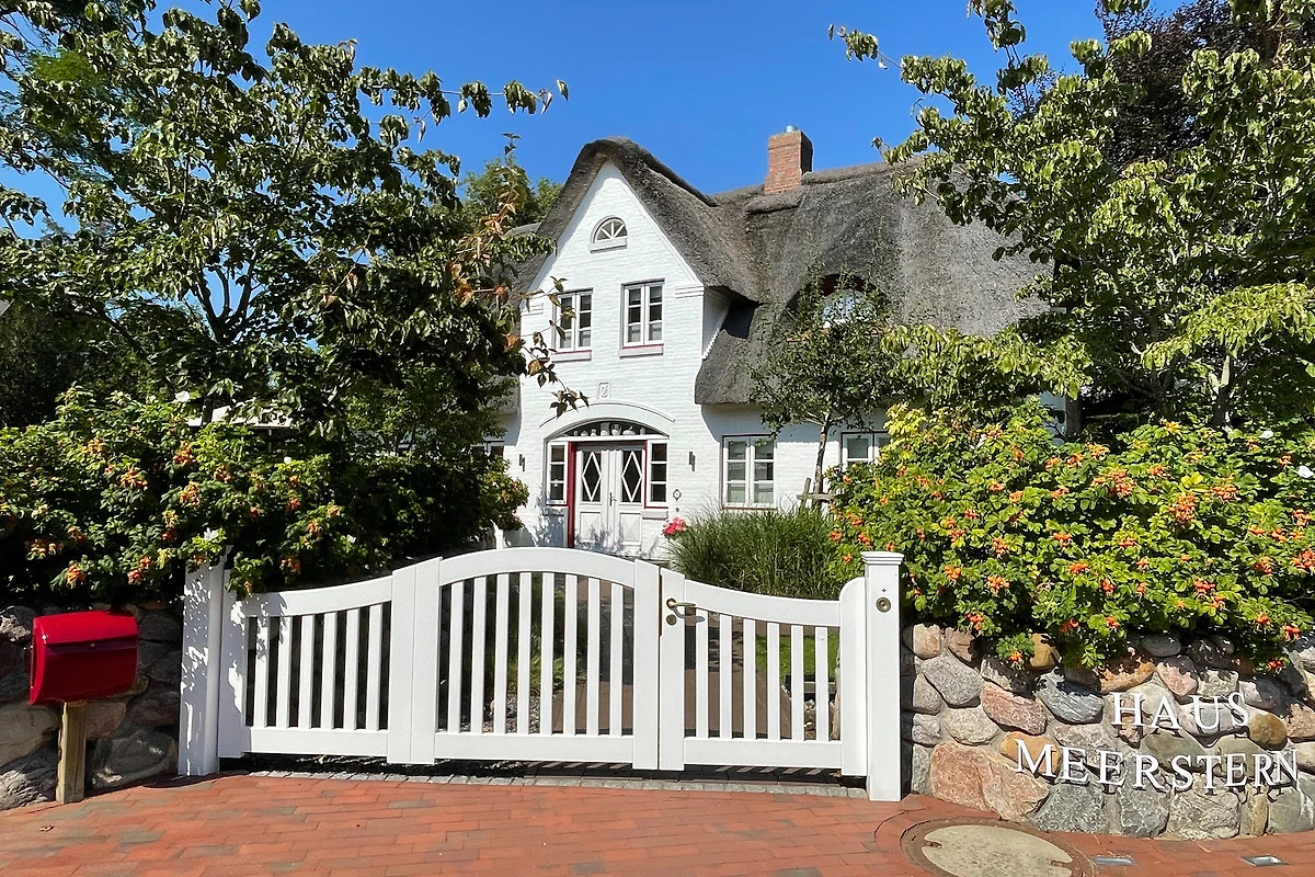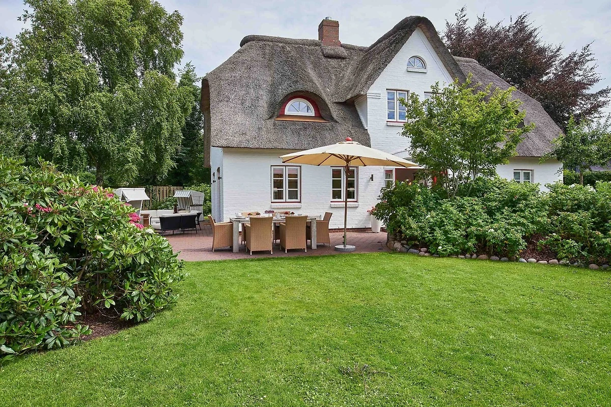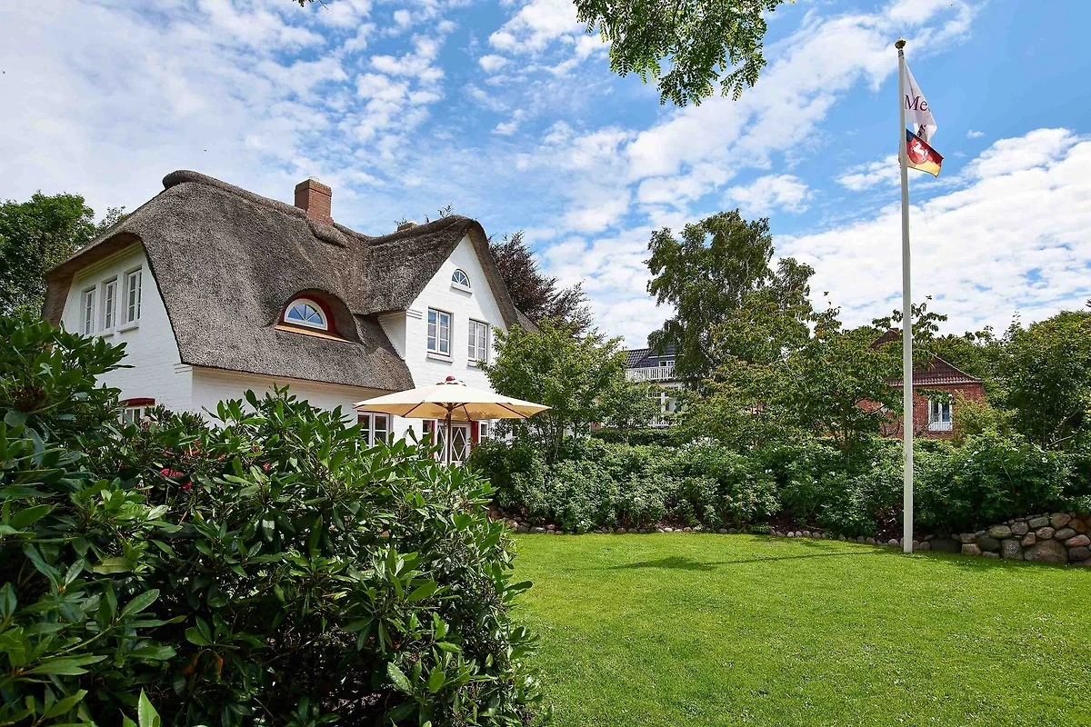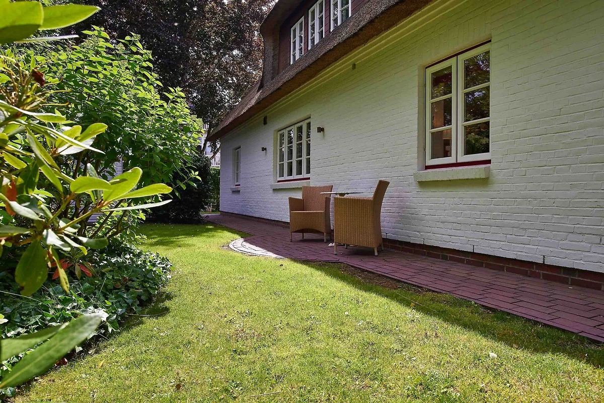 Entdecken Sie das versteckte, märchenhaft im Herzen von Wyk gelegene Einzelhaus unter Reet, das idyllisch und sehr ruhig in zweiter Reihe nur von Gärten umsäumt auf einem ca. 1.000 m2 grossen, eingewachsenen Grundstück liegt. Der wunderschön angelegte Garten bietet durch innere Friesenwälle viel Privatsphäre und durch Illumination am Abend eine aussergewöhnliche Atmosphäre. Die stilvolle Einrichtung der Villa ist ein stimmiger Mix aus modernen Möbeln und antiken Einzelstücken. Geniessen Sie die exklusiven Bäder und den Besuch in der geräumigen Gartensauna. Sie werden sich sicher gern an die gemütlichen Abende vor dem historischen Kachelofen im Wohnzimmer erinnern. Auch zwei der geräumigen Schlafräume sind mit je einem Panoramaofen ausgestattet. Nur ein kurzer Fussweg führt Sie zu den Einkaufsmöglichkeiten und der Promenade mit Badestrand, Bars und Cafes.