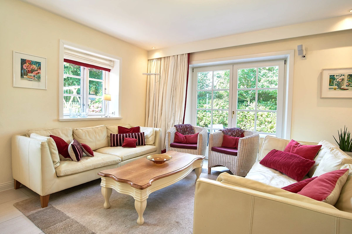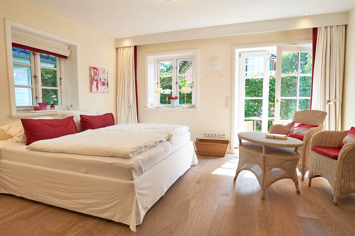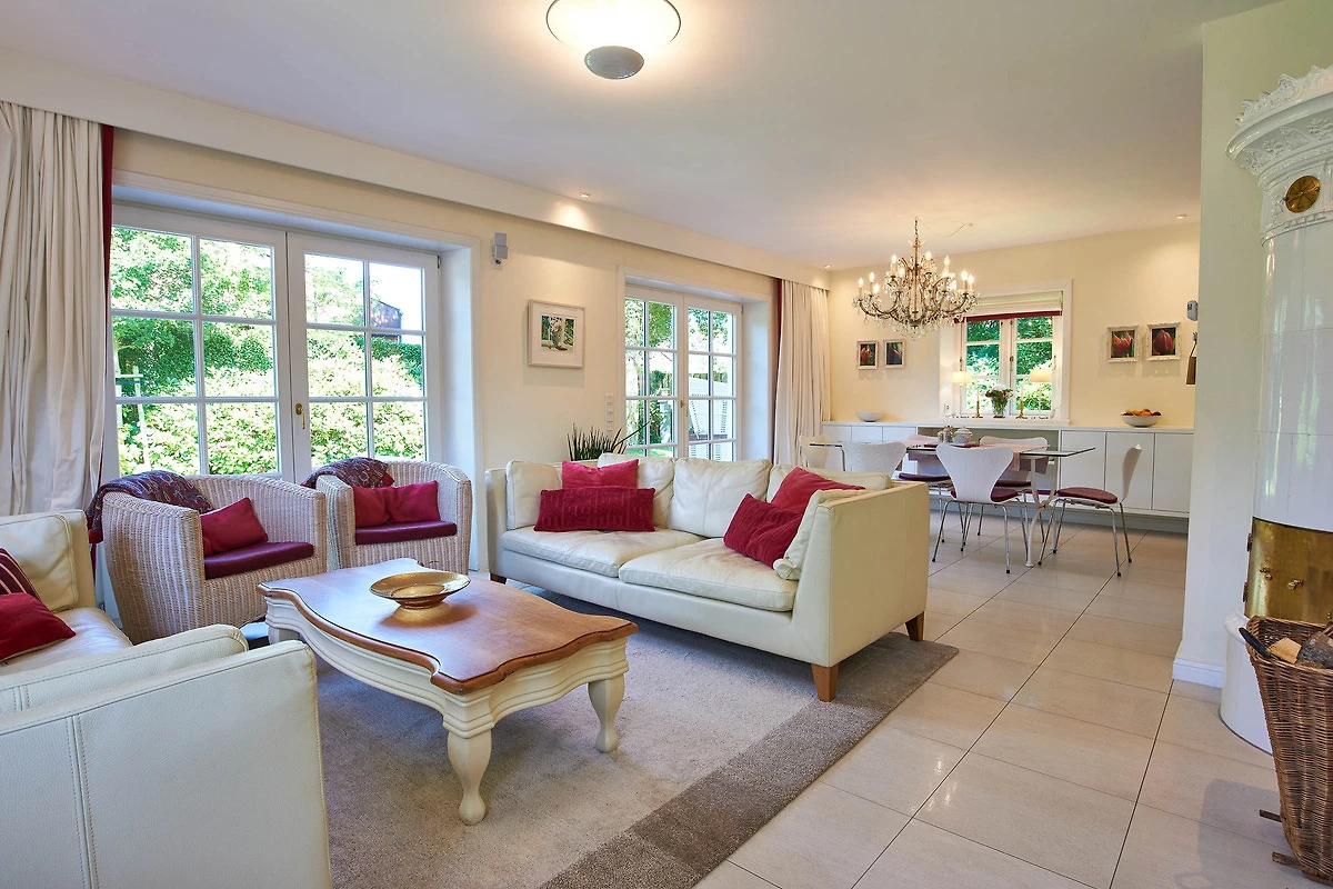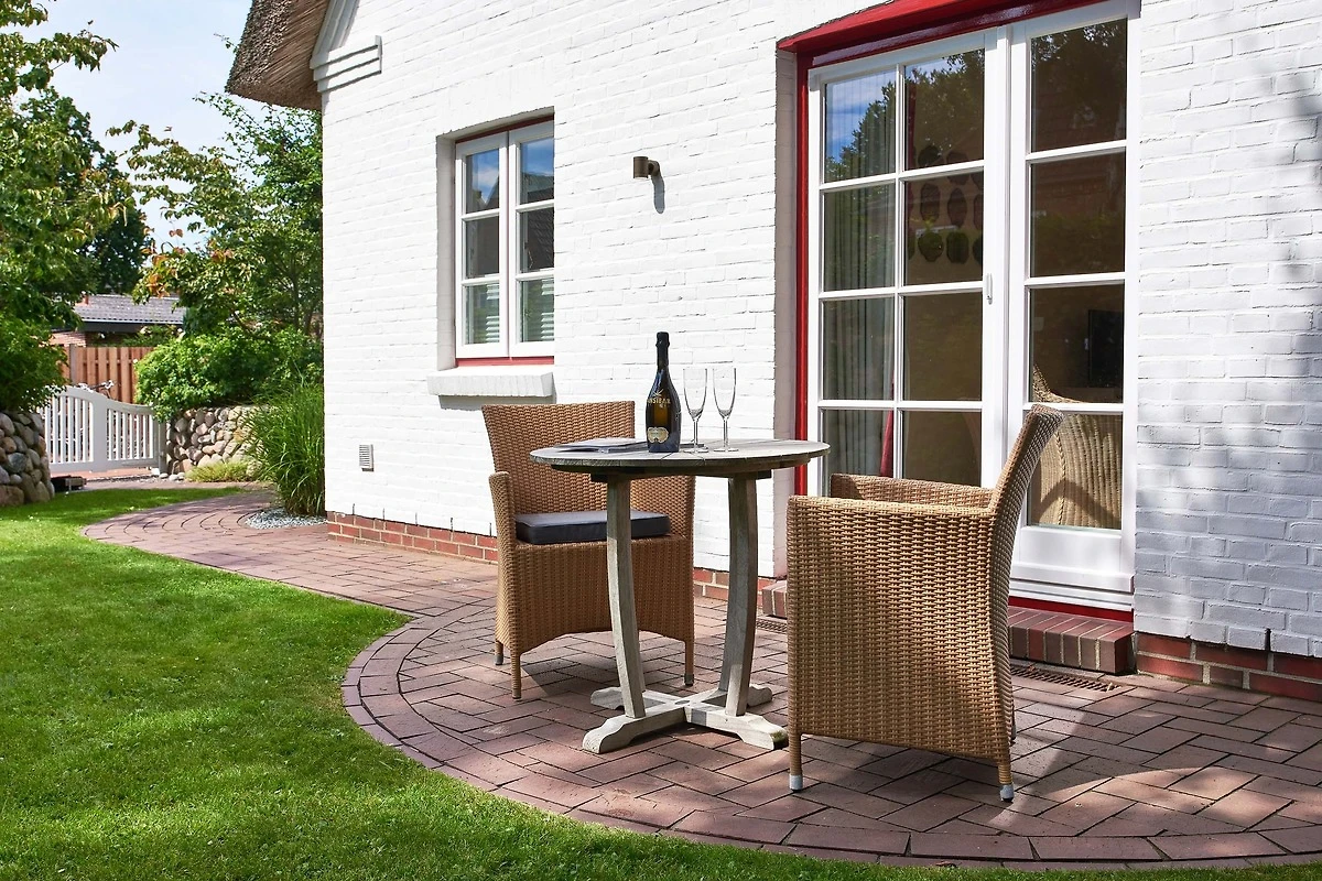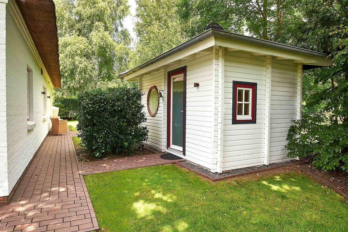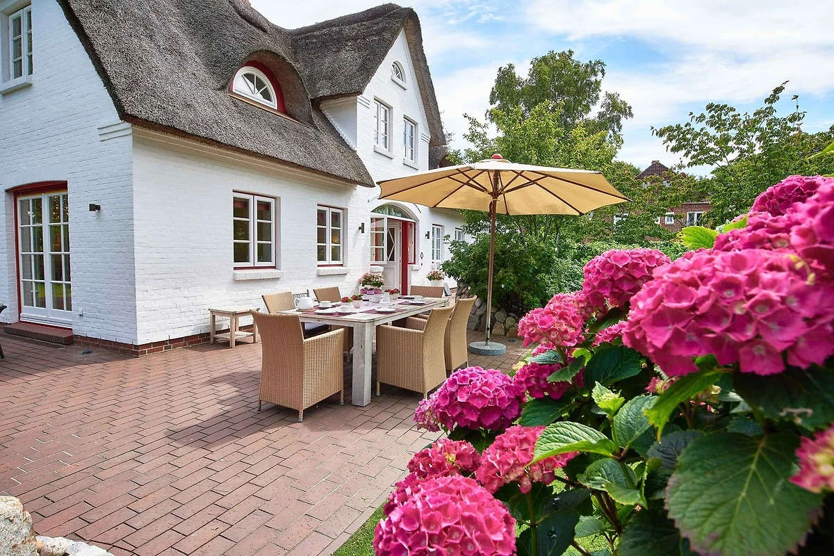 Entdecken Sie das versteckte, märchenhaft im Herzen von Wyk gelegene Einzelhaus unter Reet, das idyllisch und sehr ruhig in zweiter Reihe nur von Gärten umsäumt auf einem ca. 1.000 m2 grossen, eingewachsenen Grundstück liegt. Der wunderschön angelegte Garten bietet durch innere Friesenwälle viel Privatsphäre und durch Illumination am Abend eine aussergewöhnliche Atmosphäre. Die stilvolle Einrichtung der Villa ist ein stimmiger Mix aus modernen Möbeln und antiken Einzelstücken. Geniessen Sie die exklusiven Bäder und den Besuch in der geräumigen Gartensauna. Sie werden sich sicher gern an die gemütlichen Abende vor dem historischen Kachelofen im Wohnzimmer erinnern. Auch zwei der geräumigen Schlafräume sind mit je einem Panoramaofen ausgestattet. Nur ein kurzer Fussweg führt Sie zu den Einkaufsmöglichkeiten und der Promenade mit Badestrand, Bars und Cafes.