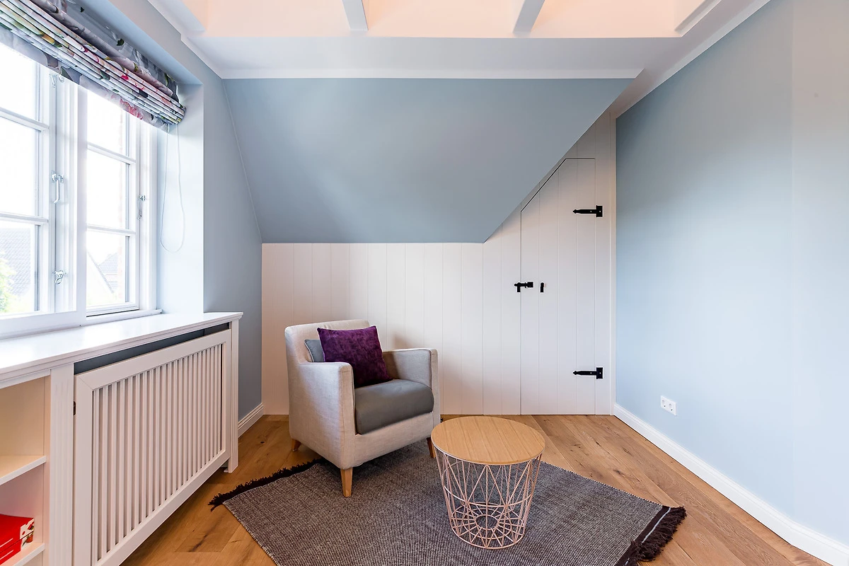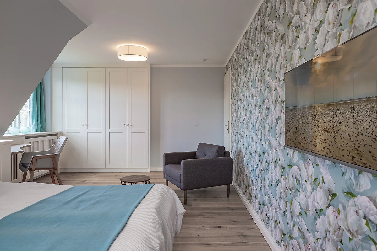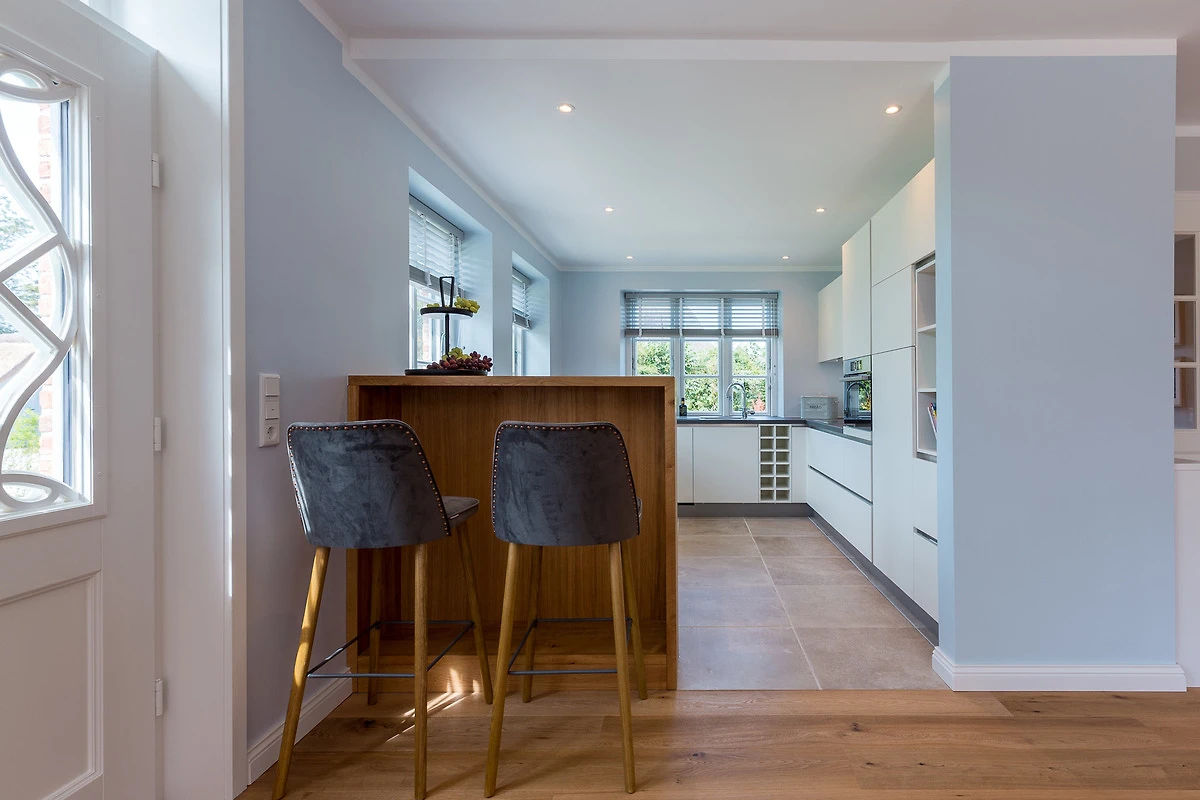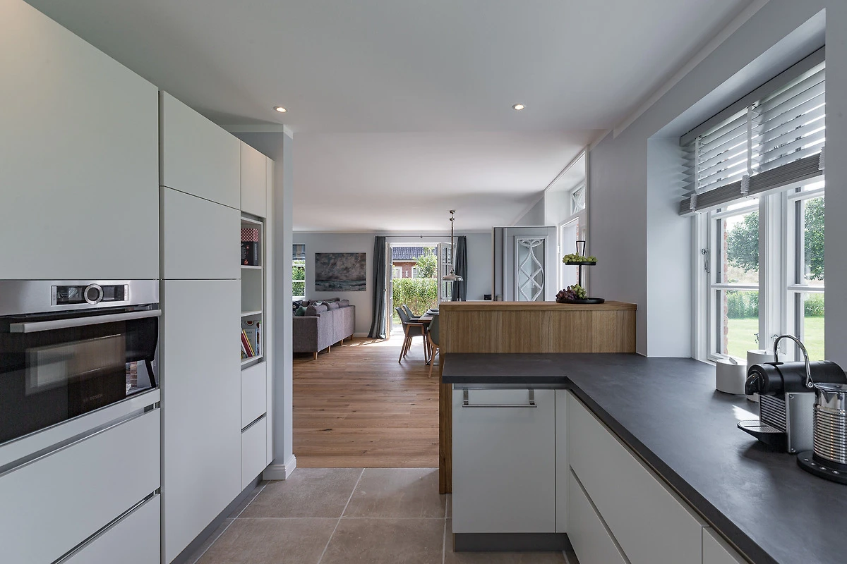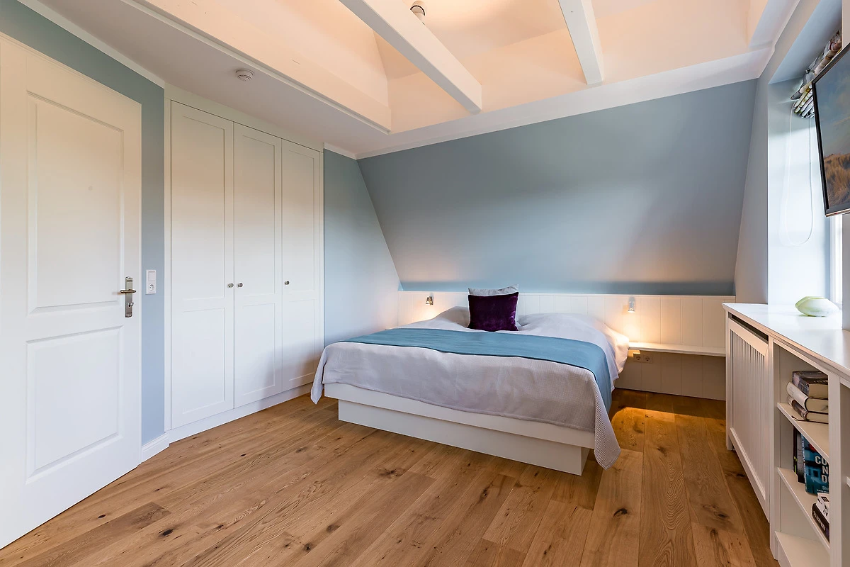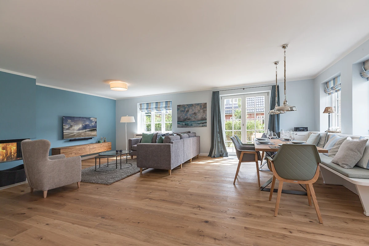 Der grosszügige Wohnraum mit integriertem Essbereich und offener Küche mit farblich schön abgestimmten Farben lässt sofort Urlaubsstimmung aufkommen. Die Bäder und Schlafräume sind jedes für sich ein Highlight. Sie werden sich sofort wohlfühlen und diese Atmosphäre geniessen. Die grosse Terrasse wartet darauf, genutzt zu werden. Der Blick in den Garten zeigt die Tiefe des Grundstücks. Natürlich fehlt auch die Sauna nicht, und der Kamin sorgt im Herbst und Winter für gemütliche Abende. Der kurze Weg zum Strand macht diese Haushälfte zu einem tollen Urlaubdomizil auf Zeit.