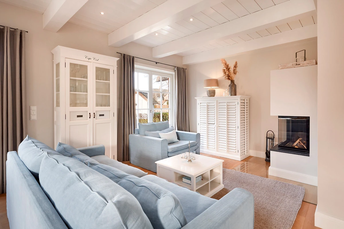 Ein Glaskamin sorgt im Wohnbereich auch an kühleren Tagen für eine gemütliche Atmosphäre. Die beiden Schlafräume befinden sich - neben dem Duschbad - im Obergeschoss des Hauses.