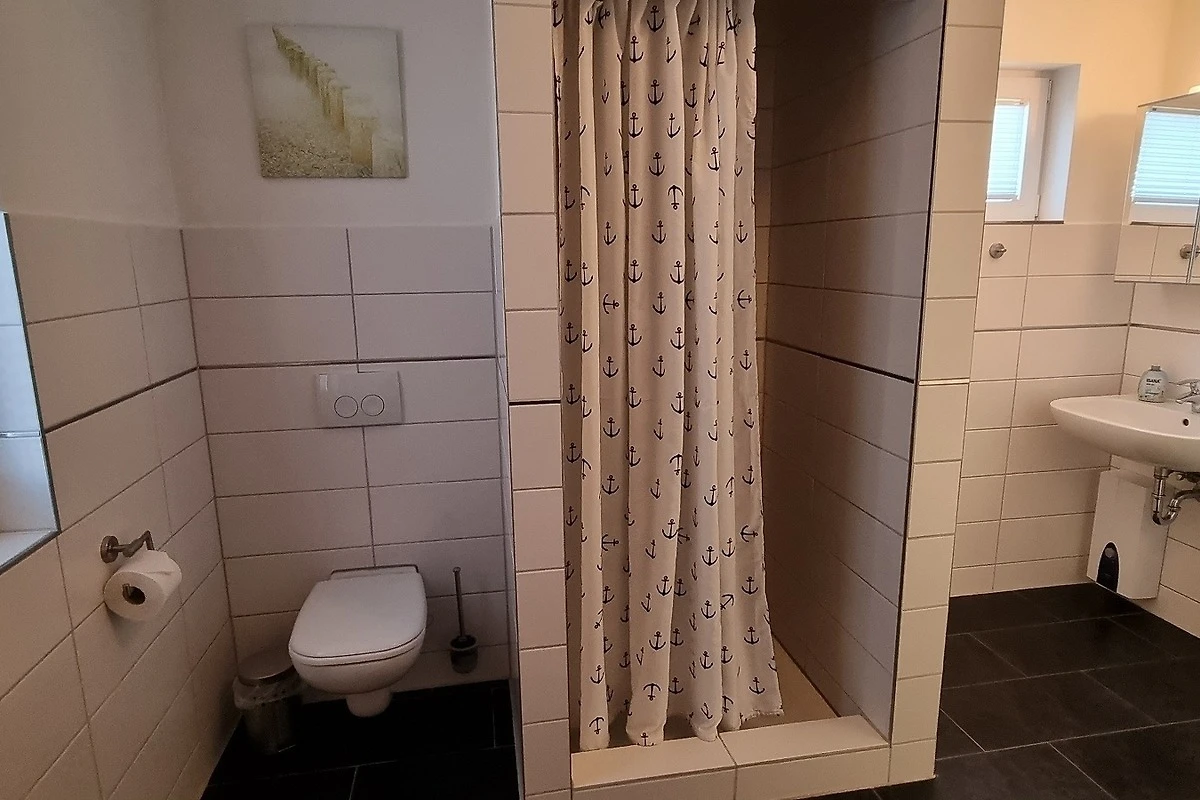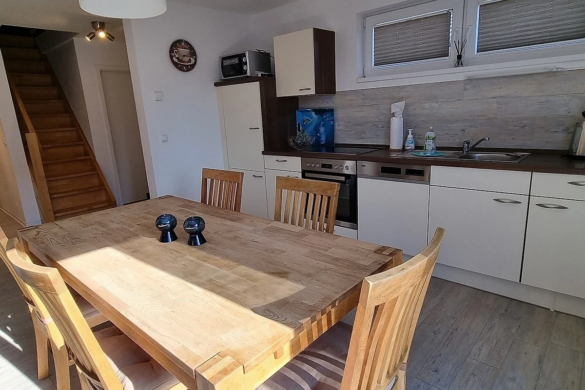 Dir ruhig gelegene Terrasse liegt zur Süd-Westseite des Ferienhauses, von dort aus haben Sie Zugang zum grossen Wohn- Essbereich. Die Küche ist modern und offen gestaltet. Im Erdgeschoss befinden sich des Weiteren zwei Schlafzimmer mit je einem Doppelbett und Kleiderschrank. Die Zimmer lassen sich mit Vorhängen verdunkeln. Ein 2. TV steht in einem Schlafzimmer zur Verfügung. Das Badezimmer im Erdgeschoss ist mit Dusche, Waschbecken und WC ausgestattet.