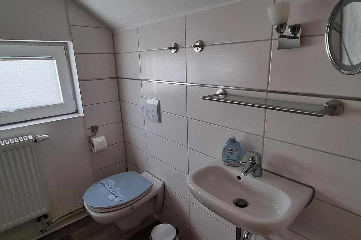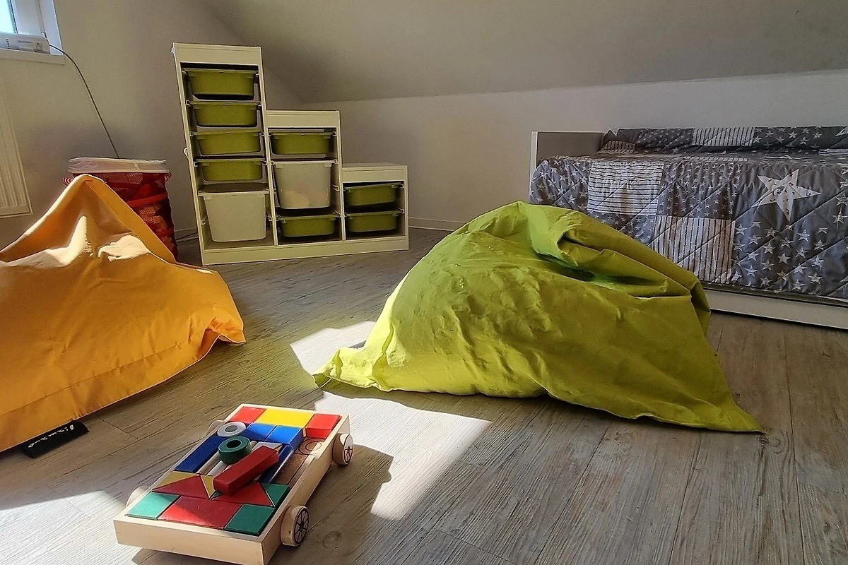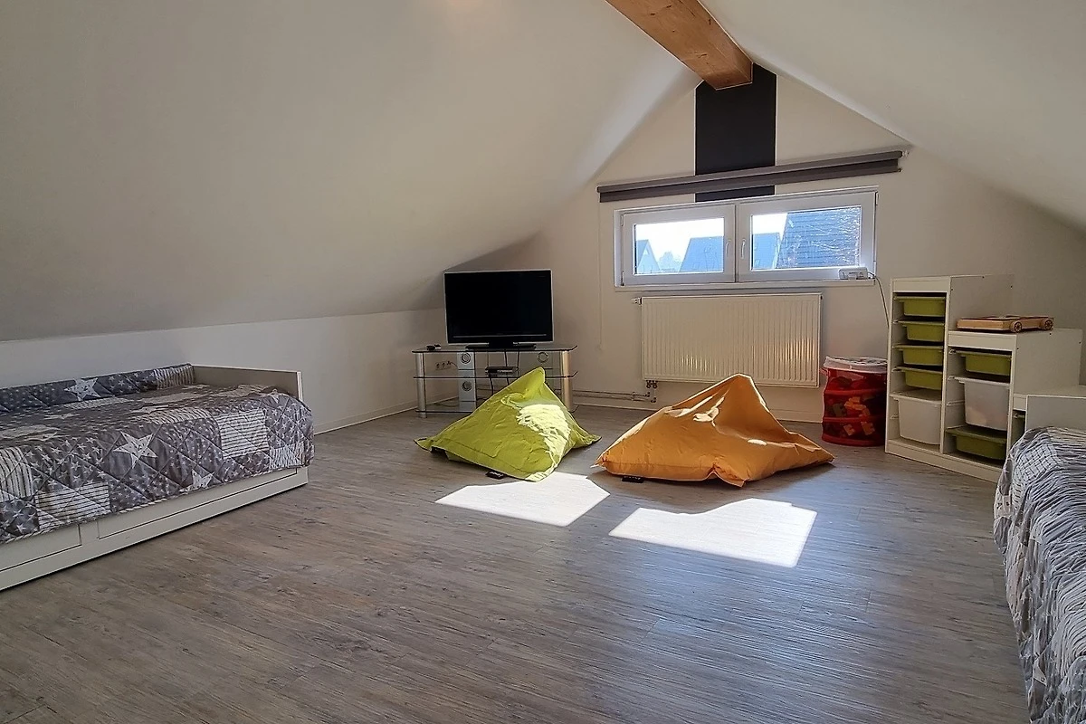 Eine Holztreppe führt in den ausgebauten Dachboden. Dort befindet sich ein weiteres grosses Schlafzimmer mit Einzelbetten und ein Gäste-WC. Das Kinderzimmer ist ebenfalls mit einem TV und vielen Spielsachen eingerichtet.