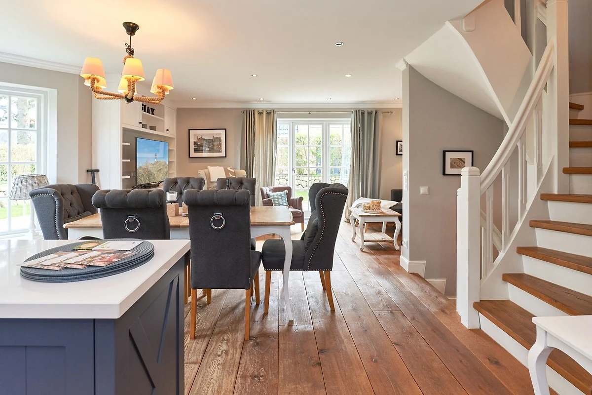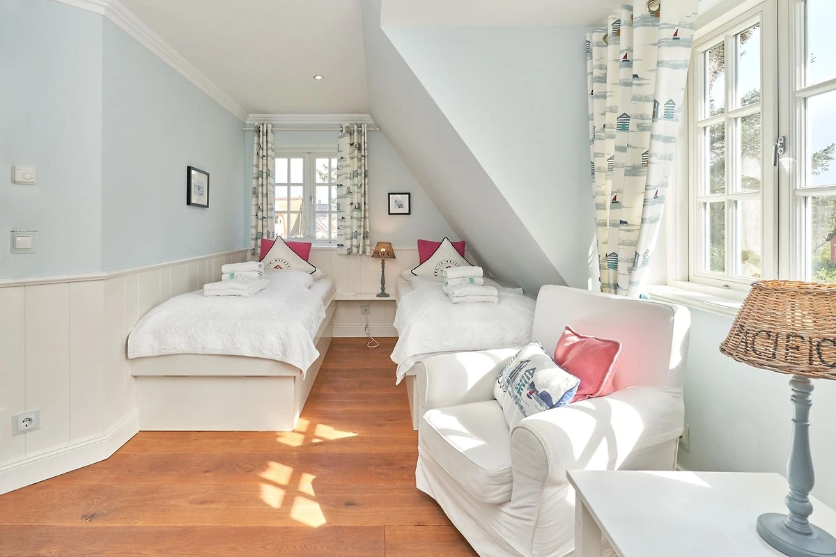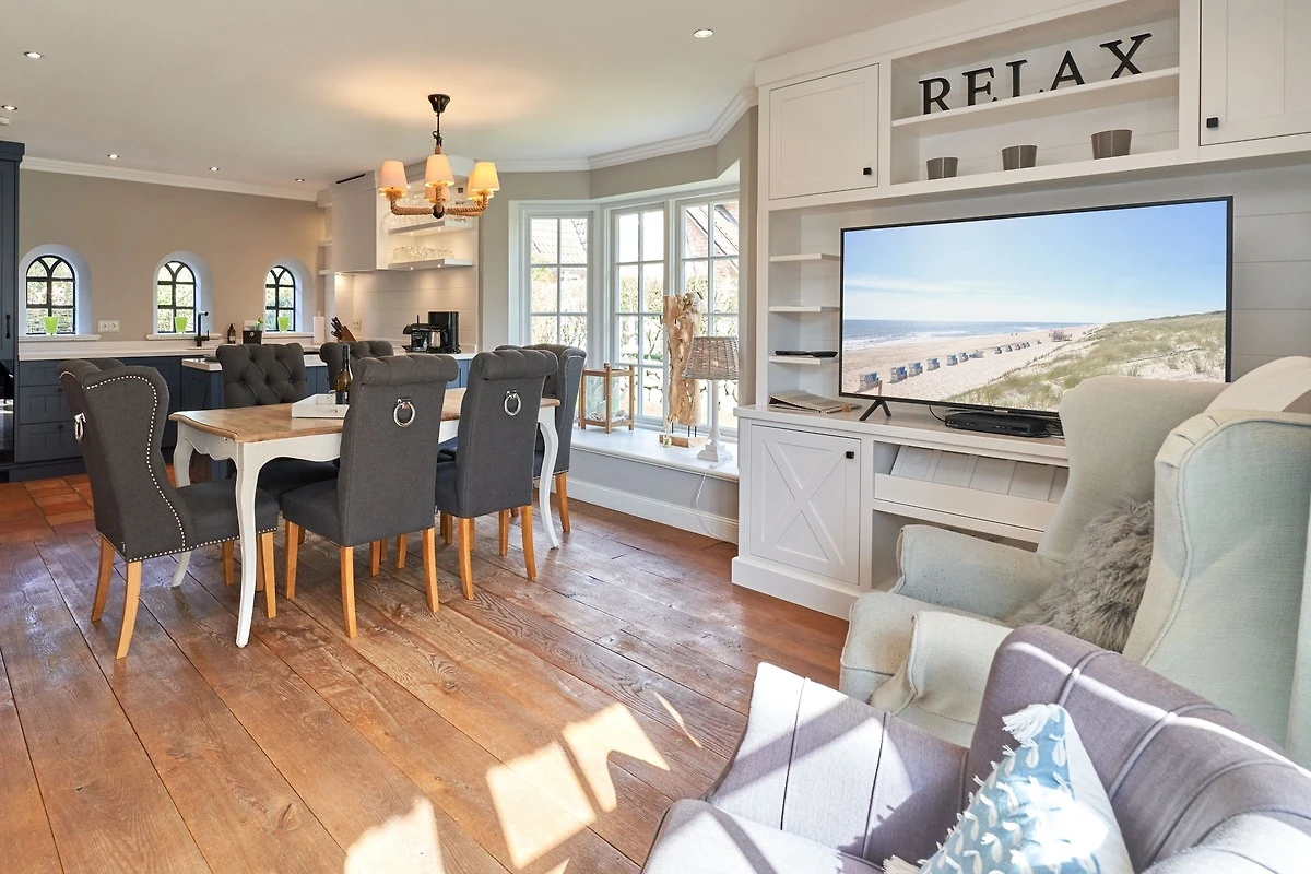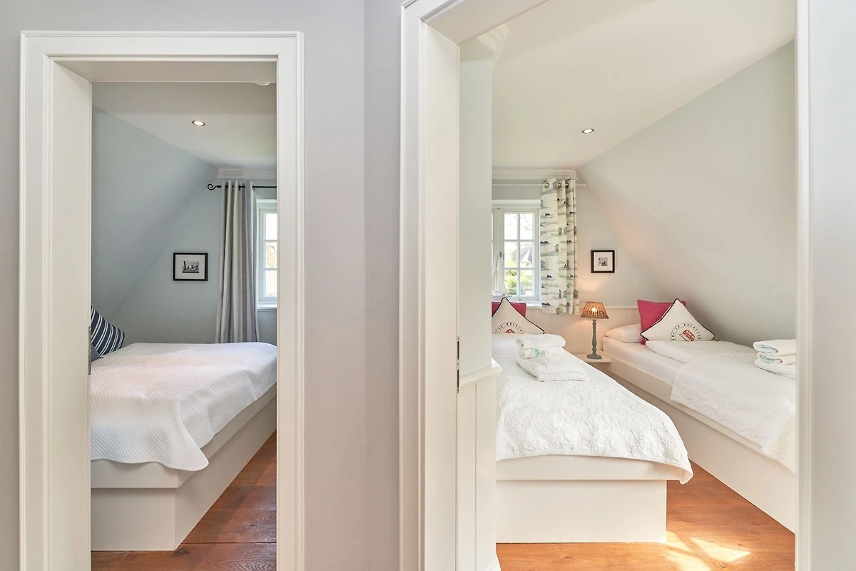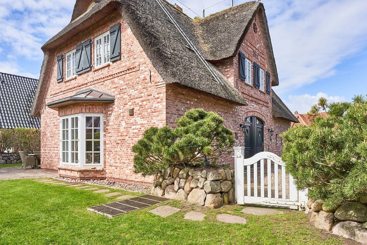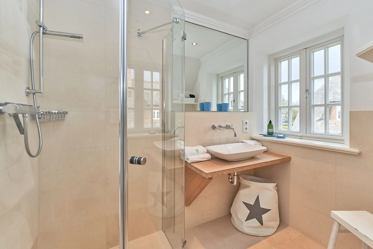 Exklusive Doppelhaushälfte unter Reet im Hampton Style für bis zu 8 Personen. Aussen Sylt , innen Hamptons. Über einen kleinen Vorflur mit Garderobe gelangt man in das grosszügige Wohnzimmer mit seiner offenen Küche mit den angrenzenden Essplatz für gemütliche Abende. Auffällig und besonders neben der hochwertigen Ausstattung ist das Beleuchtungskonzept sowie die Holzeinbauten mit IPhone - Ladestationen. Im Obergeschoss verfügt über zwei Schlafzimmer und ein Badezimmer mit bodengleicher Dusche. Der ausgebaute Spitzboden verfügt über zwei weitere Einzelbetten. Im Untergeschoss befindet ein Schlafzimmer mit Doppelbett und Schrankeinbauten sowie ein weiteres Wohn und Schlafzimmer. Eine Sauna mit grosszügigen Bad ist ebenfalls vorhanden. Der Technik und Hauswirtschafsraum verfügt über eine Waschmaschine und Trockner.