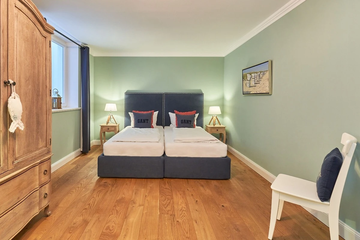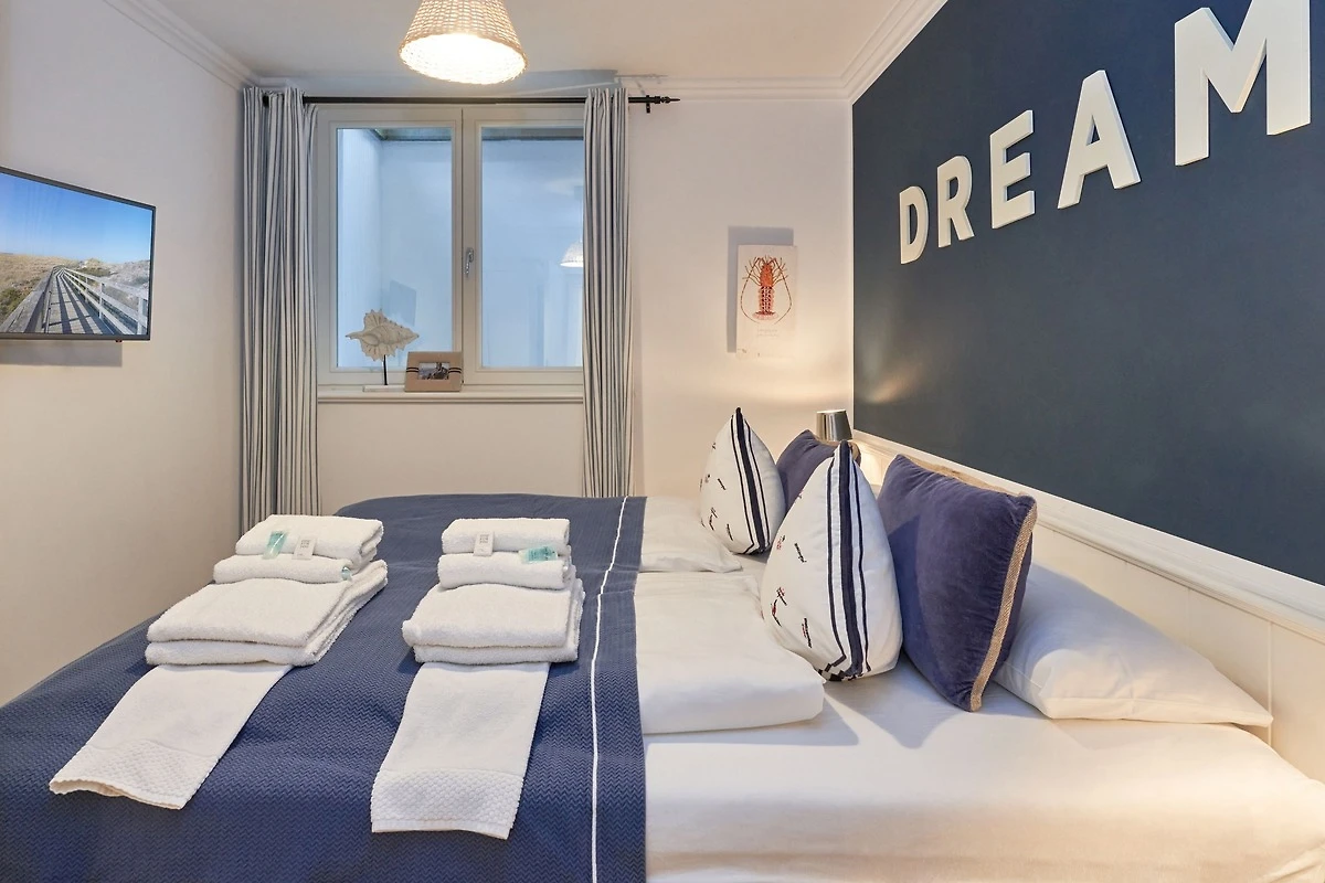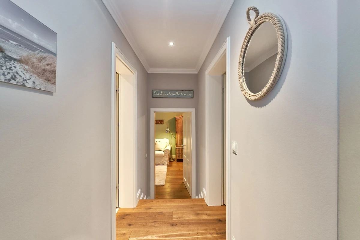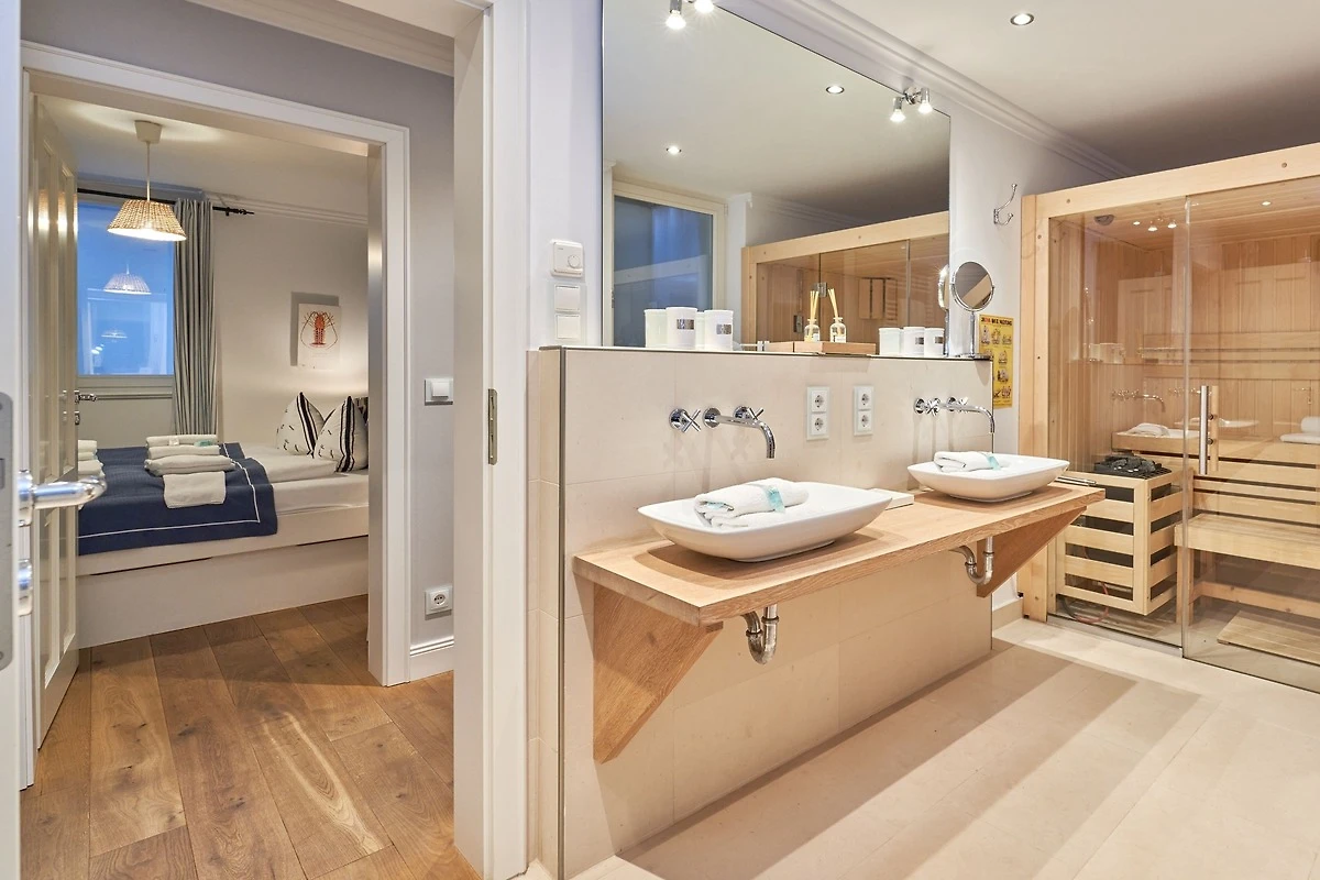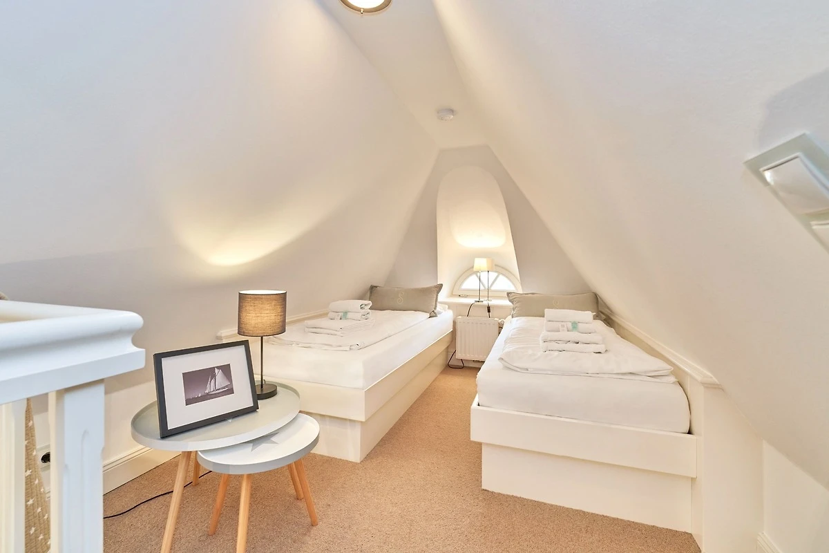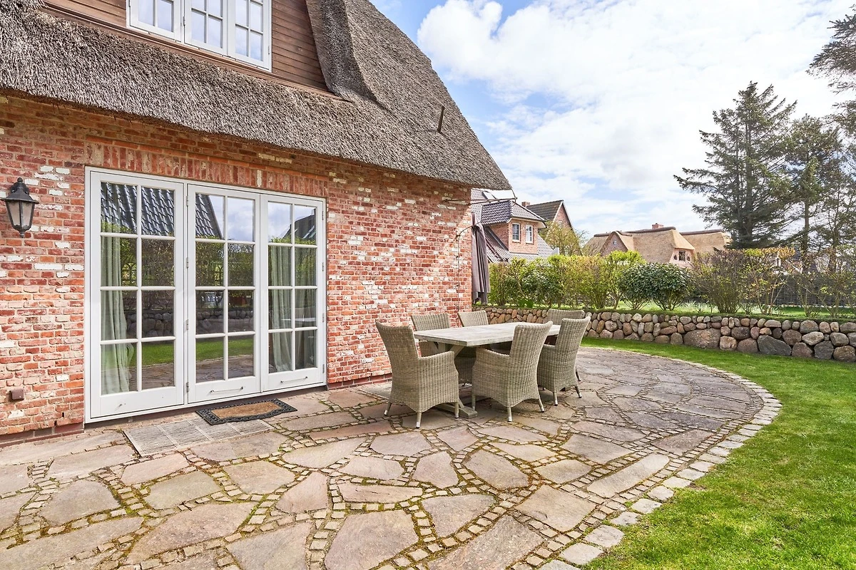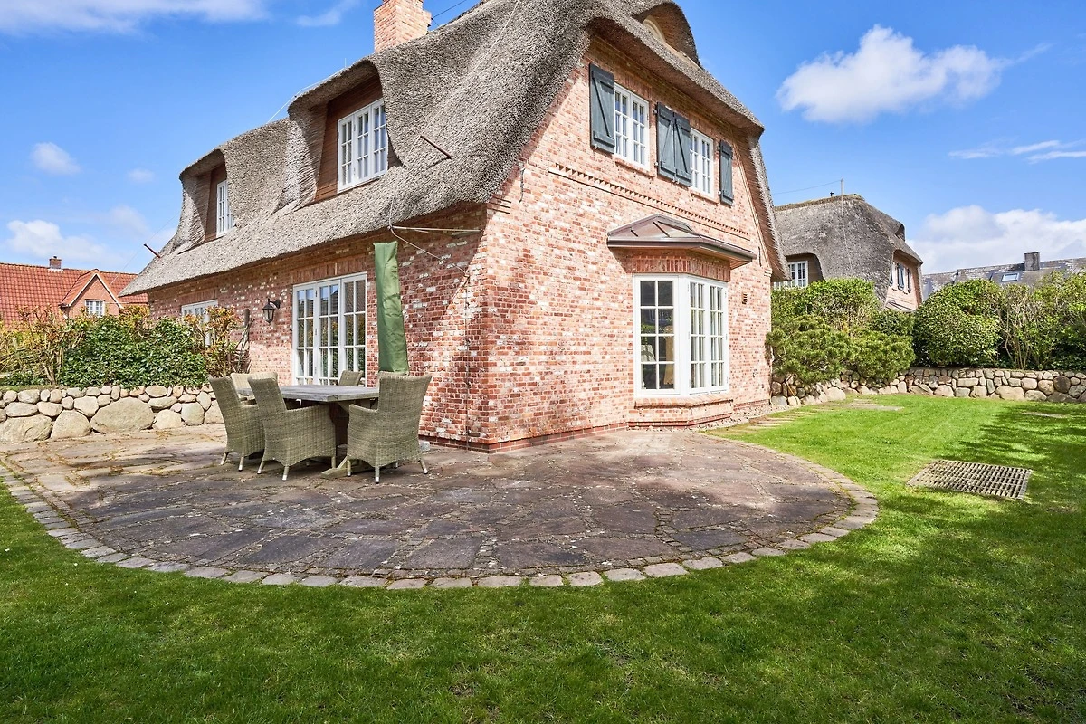 Exklusive Doppelhaushälfte unter Reet im Hampton Style für bis zu 8 Personen. Aussen Sylt , innen Hamptons. Über einen kleinen Vorflur mit Garderobe gelangt man in das grosszügige Wohnzimmer mit seiner offenen Küche mit den angrenzenden Essplatz für gemütliche Abende. Auffällig und besonders neben der hochwertigen Ausstattung ist das Beleuchtungskonzept sowie die Holzeinbauten mit IPhone - Ladestationen. Im Obergeschoss verfügt über zwei Schlafzimmer und ein Badezimmer mit bodengleicher Dusche. Der ausgebaute Spitzboden verfügt über zwei weitere Einzelbetten. Im Untergeschoss befindet ein Schlafzimmer mit Doppelbett und Schrankeinbauten sowie ein weiteres Wohn und Schlafzimmer. Eine Sauna mit grosszügigen Bad ist ebenfalls vorhanden. Der Technik und Hauswirtschafsraum verfügt über eine Waschmaschine und Trockner.