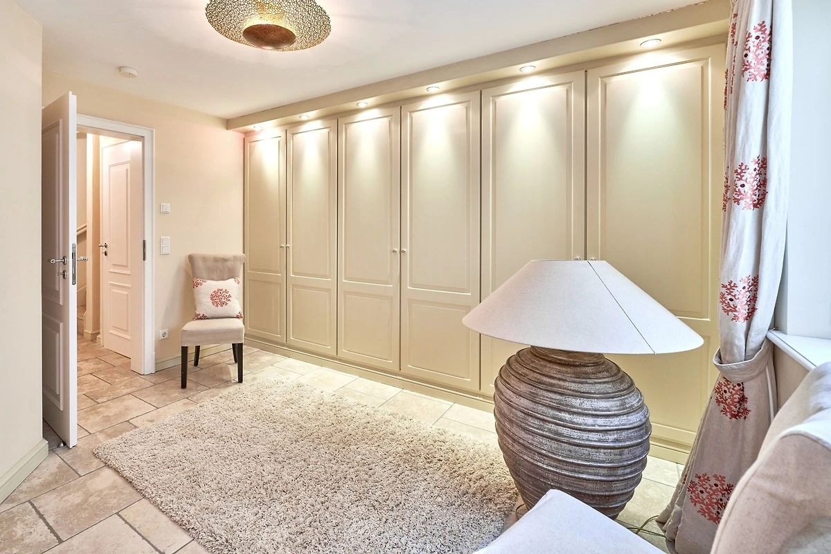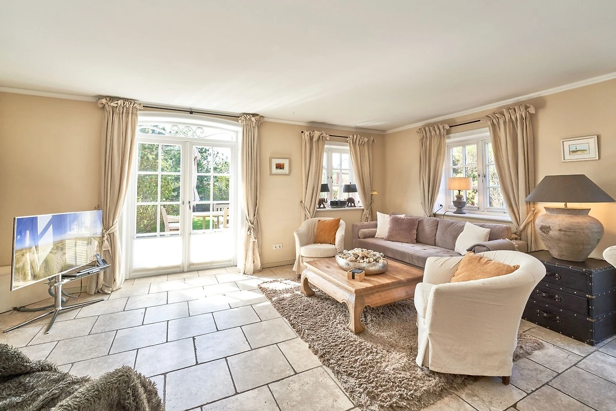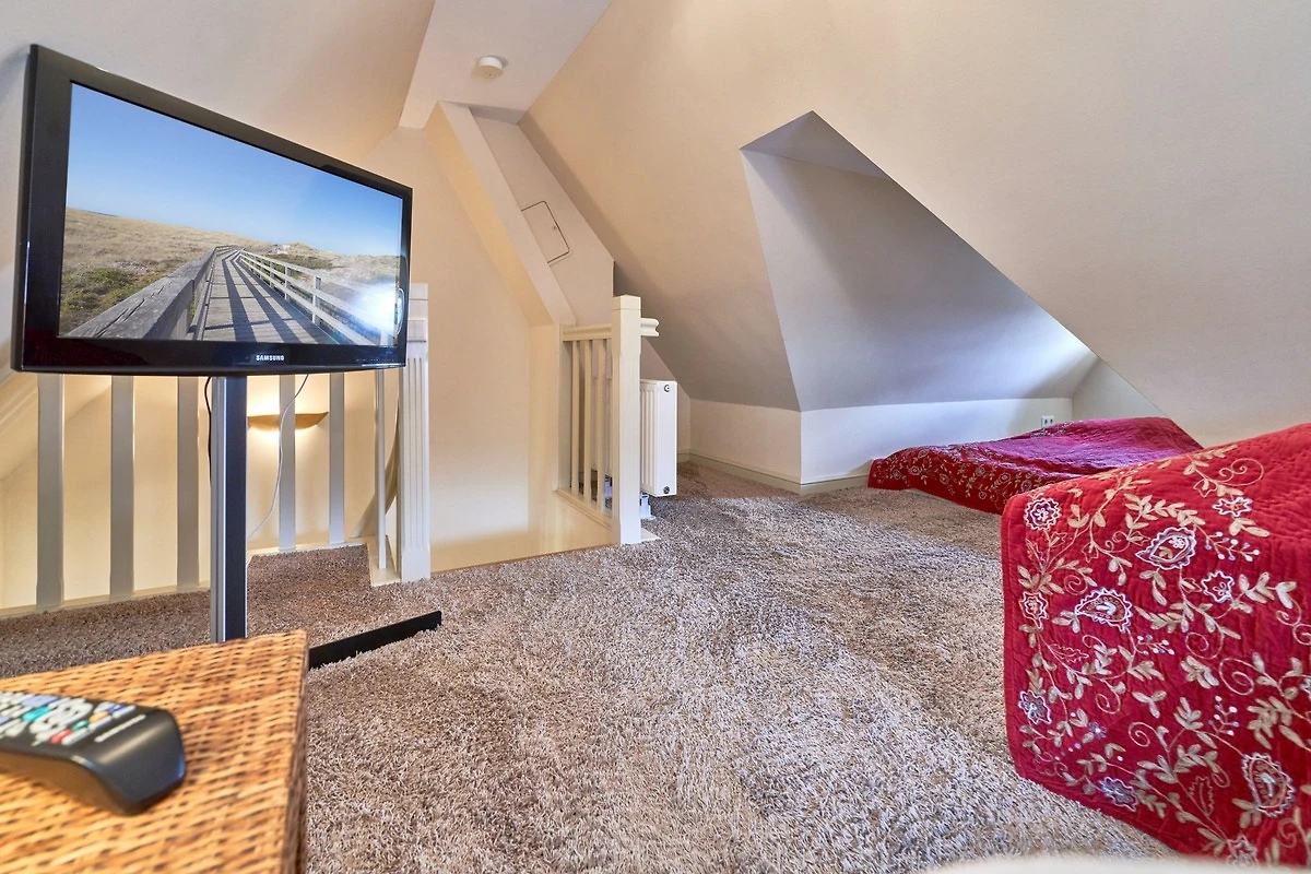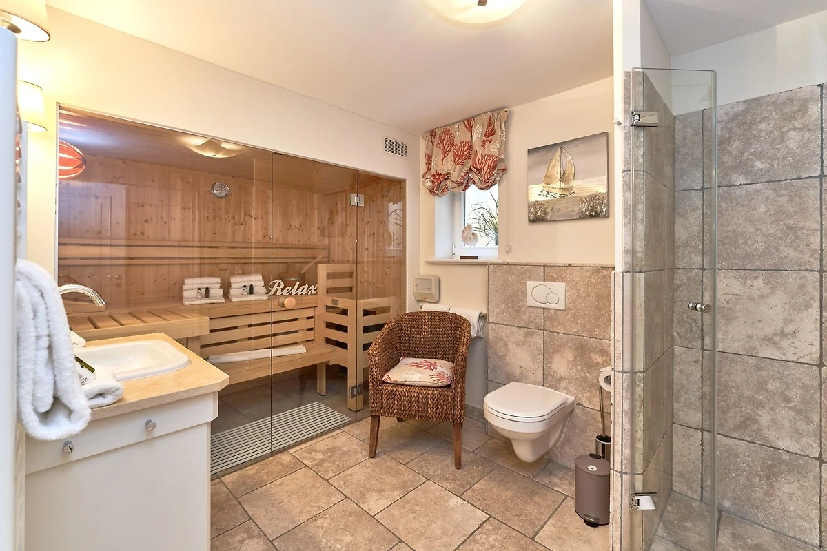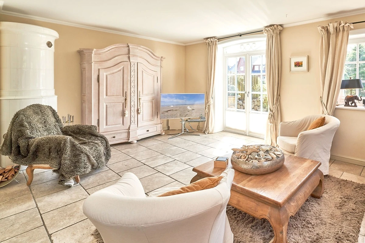 Das Ambiente auf den drei Ebenen des Hauses erfreut durch liebevoll ausgesuchte Ausstattung und im modernen Landhaus Stil. Der lichtdurchflutete Wohnraum, die herrliche Süd-West Terrasse tragen zu ihrem Wohlbefinden bei. Das Sunny Hüs wurde mit sehr viel Liebe zum Detail eingerichtet. Im Erdgeschoss befindet sich die Diele mit seinen grosszügigen Garderobenschrank und das angrenzende Gäste - WC. Durch eine Doppeltür betreten Sie ein helles und grosszügiges Wohnzimmer mit einem antiken, nordischen Kachelofen, eine offene Küche mit angrenzender Essecke für 6 Personen ist ebenfalls vorhanden. Im Obergeschoss erwartet Sie ein geräumiges Schlafzimmer mit Doppelbett und Schrankeinbauten und der Fussboden ist mit gekelchten Echthausdielen ausgestattet. Ausserdem hat das Schlafzimmer noch einen Elektrokamin und verfügt über einen Fernseher. Das angrenzende grosse Badezimmer mit Dusche und Wanne verfügt noch über ein Waschtisch mit zwei aufgesetzten Waschbecken. Die Diele im Obergeschoss verfügt über einen kleinen separaten Arbeitsplatz und ein Bucherregal. Im Untergeschoss befinden jeweils zwei Schlafzimmer mit einen Doppelbett und Einbauschränken. sowie ein Badzimmer mit Dusche und WC. Für Ihr Wohlbefinden gibt es hier noch eine Sauna mit Glasfront mit Blick in das Badezimmer. Ein kleiner separater Hauswirtschaftraum mit Waschmaschine und Trockner ist ebenfalls vorhanden.