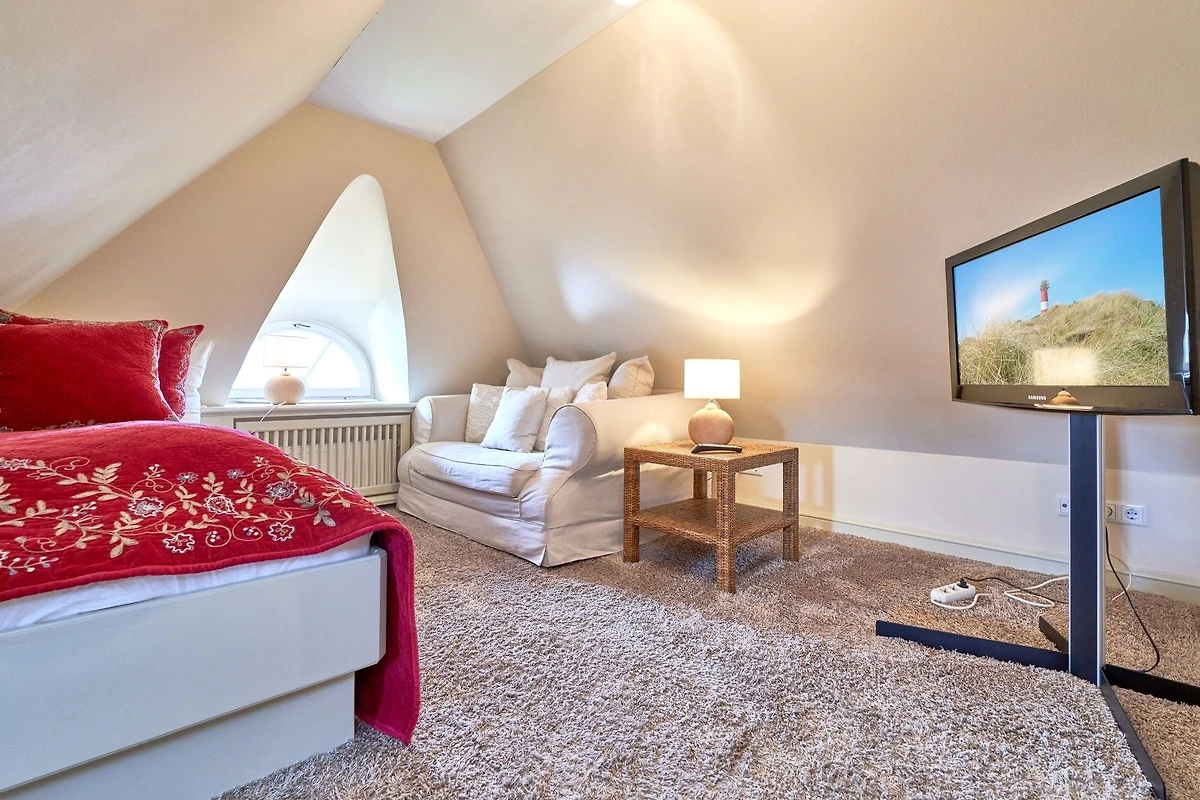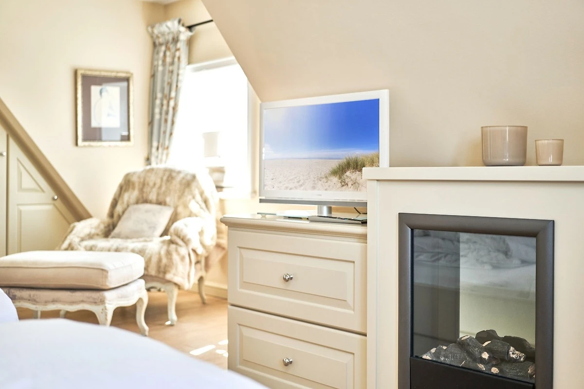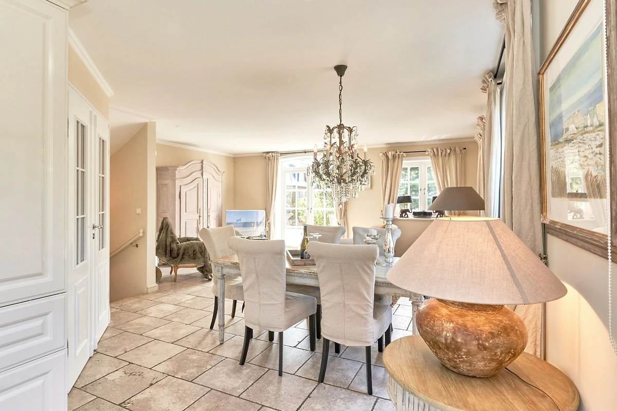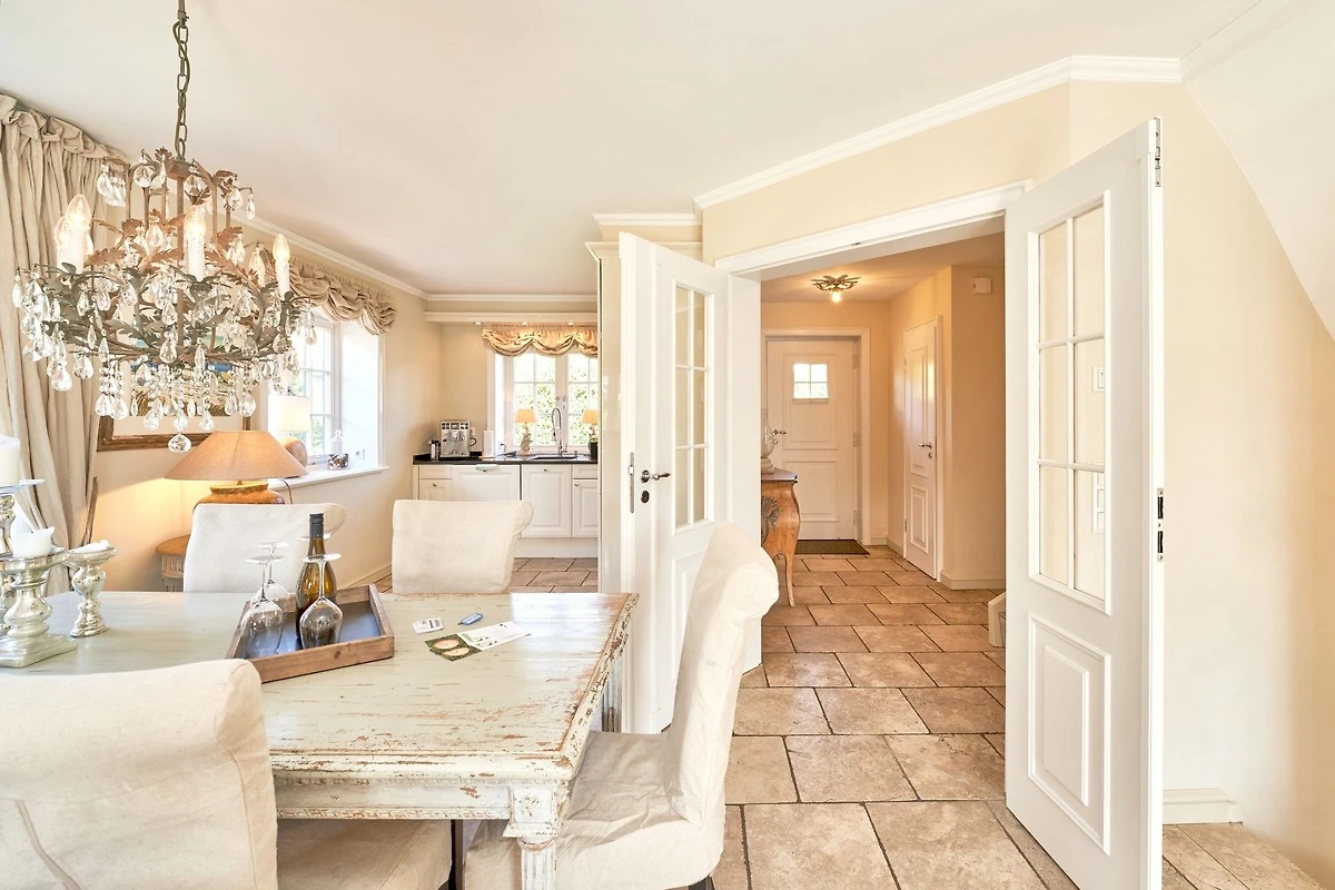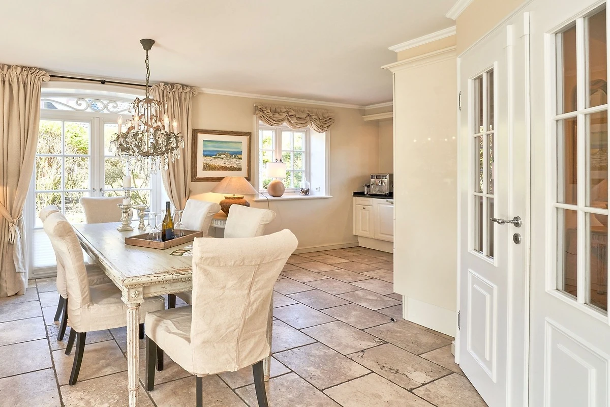 Das Ambiente auf den drei Ebenen des Hauses erfreut durch liebevoll ausgesuchte Ausstattung und im modernen Landhaus Stil. Der lichtdurchflutete Wohnraum, die herrliche Süd-West Terrasse tragen zu ihrem Wohlbefinden bei. Das Sunny Hüs wurde mit sehr viel Liebe zum Detail eingerichtet. Im Erdgeschoss befindet sich die Diele mit seinen grosszügigen Garderobenschrank und das angrenzende Gäste - WC. Durch eine Doppeltür betreten Sie ein helles und grosszügiges Wohnzimmer mit einem antiken, nordischen Kachelofen, eine offene Küche mit angrenzender Essecke für 6 Personen ist ebenfalls vorhanden. Im Obergeschoss erwartet Sie ein geräumiges Schlafzimmer mit Doppelbett und Schrankeinbauten und der Fussboden ist mit gekelchten Echthausdielen ausgestattet. Ausserdem hat das Schlafzimmer noch einen Elektrokamin und verfügt über einen Fernseher. Das angrenzende grosse Badezimmer mit Dusche und Wanne verfügt noch über ein Waschtisch mit zwei aufgesetzten Waschbecken. Die Diele im Obergeschoss verfügt über einen kleinen separaten Arbeitsplatz und ein Bucherregal. Im Untergeschoss befinden jeweils zwei Schlafzimmer mit einen Doppelbett und Einbauschränken. sowie ein Badzimmer mit Dusche und WC. Für Ihr Wohlbefinden gibt es hier noch eine Sauna mit Glasfront mit Blick in das Badezimmer. Ein kleiner separater Hauswirtschaftraum mit Waschmaschine und Trockner ist ebenfalls vorhanden.