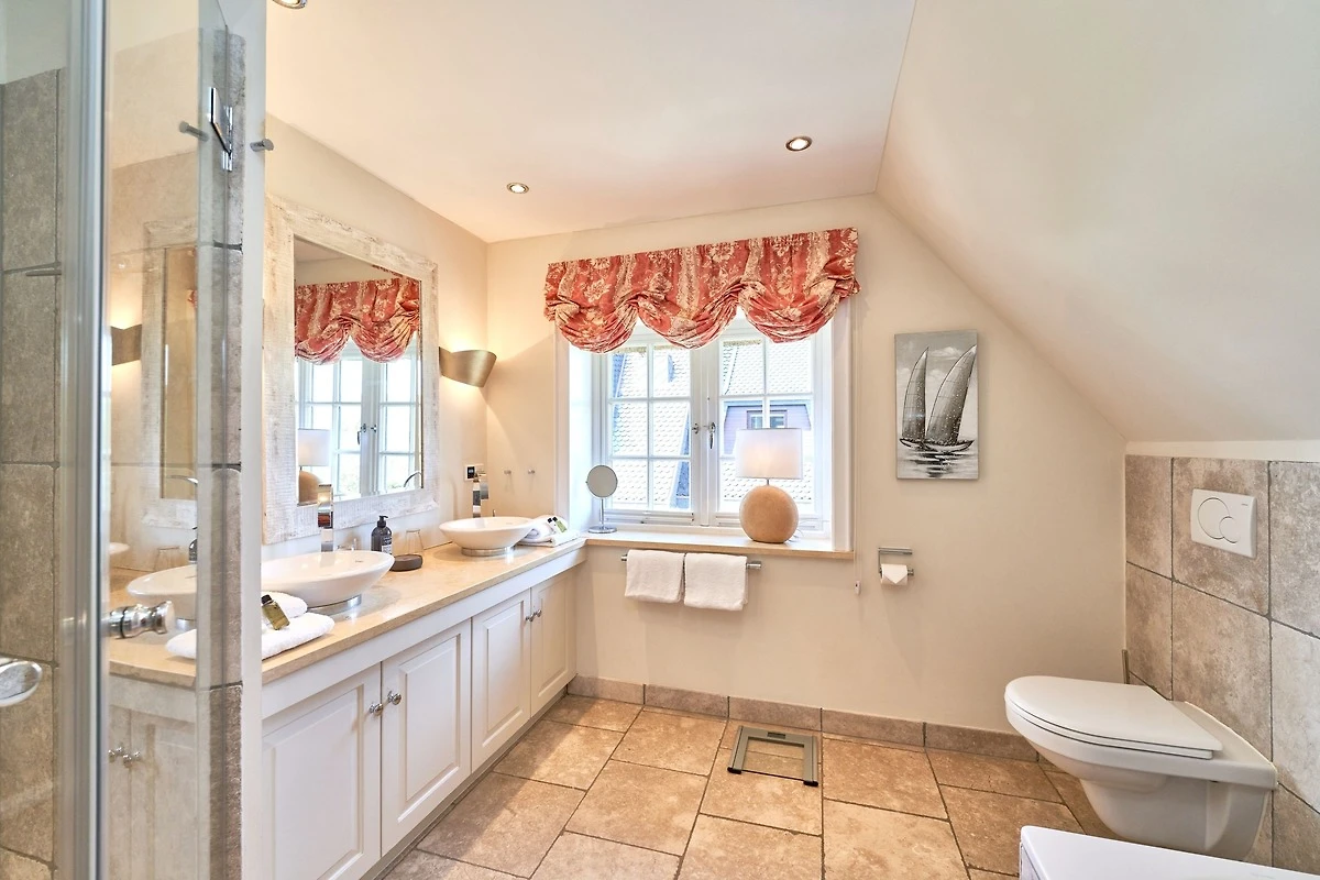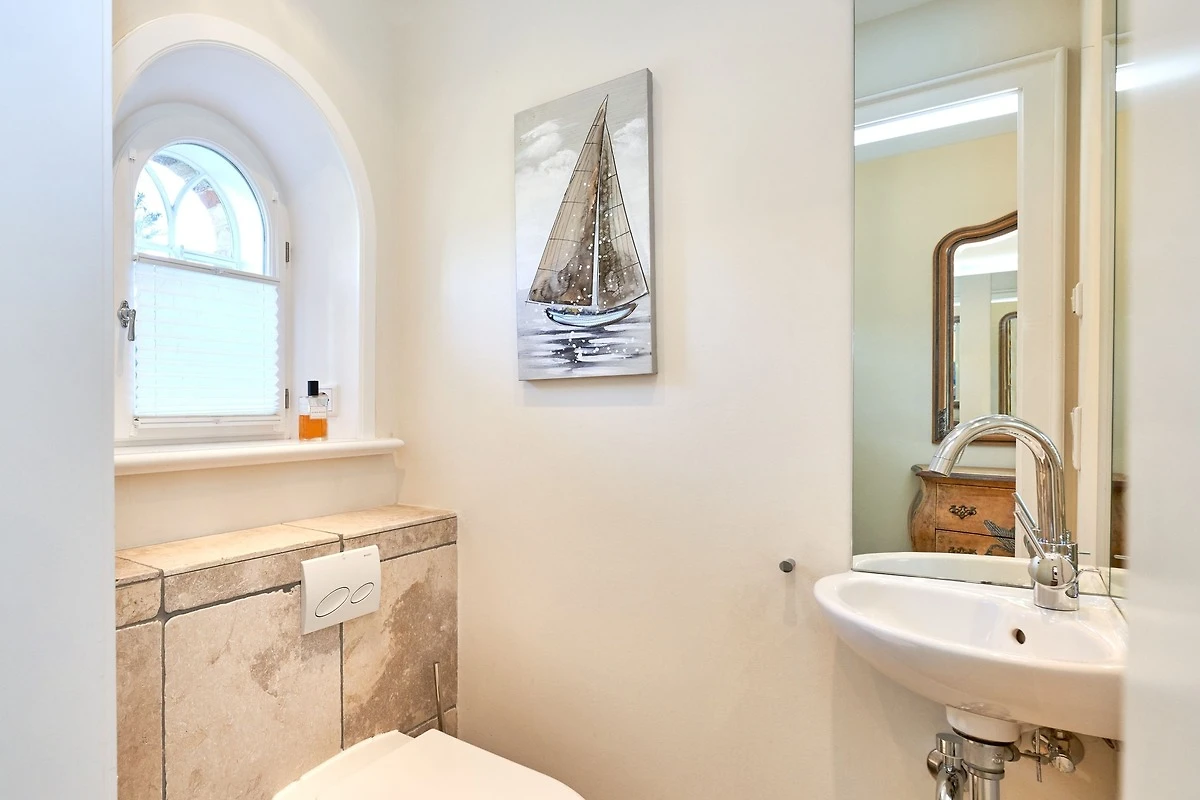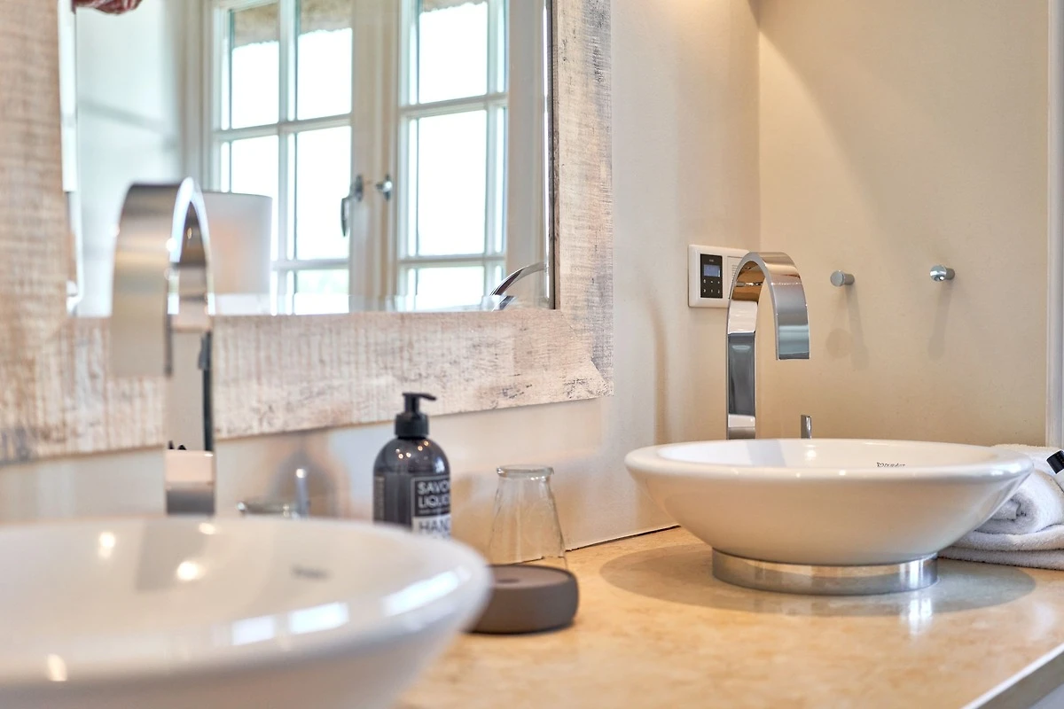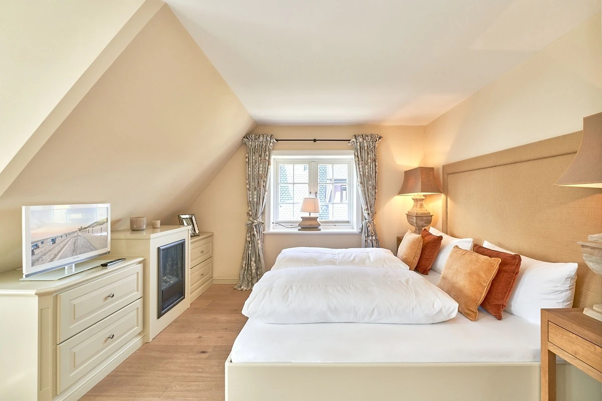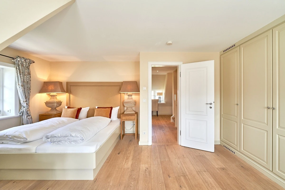 Das Ambiente auf den drei Ebenen des Hauses erfreut durch liebevoll ausgesuchte Ausstattung und im modernen Landhaus Stil. Der lichtdurchflutete Wohnraum, die herrliche Süd-West Terrasse tragen zu ihrem Wohlbefinden bei. Das Sunny Hüs wurde mit sehr viel Liebe zum Detail eingerichtet. Im Erdgeschoss befindet sich die Diele mit seinen grosszügigen Garderobenschrank und das angrenzende Gäste - WC. Durch eine Doppeltür betreten Sie ein helles und grosszügiges Wohnzimmer mit einem antiken, nordischen Kachelofen, eine offene Küche mit angrenzender Essecke für 6 Personen ist ebenfalls vorhanden. Im Obergeschoss erwartet Sie ein geräumiges Schlafzimmer mit Doppelbett und Schrankeinbauten und der Fussboden ist mit gekelchten Echthausdielen ausgestattet. Ausserdem hat das Schlafzimmer noch einen Elektrokamin und verfügt über einen Fernseher. Das angrenzende grosse Badezimmer mit Dusche und Wanne verfügt noch über ein Waschtisch mit zwei aufgesetzten Waschbecken. Die Diele im Obergeschoss verfügt über einen kleinen separaten Arbeitsplatz und ein Bucherregal. Im Untergeschoss befinden jeweils zwei Schlafzimmer mit einen Doppelbett und Einbauschränken. sowie ein Badzimmer mit Dusche und WC. Für Ihr Wohlbefinden gibt es hier noch eine Sauna mit Glasfront mit Blick in das Badezimmer. Ein kleiner separater Hauswirtschaftraum mit Waschmaschine und Trockner ist ebenfalls vorhanden.