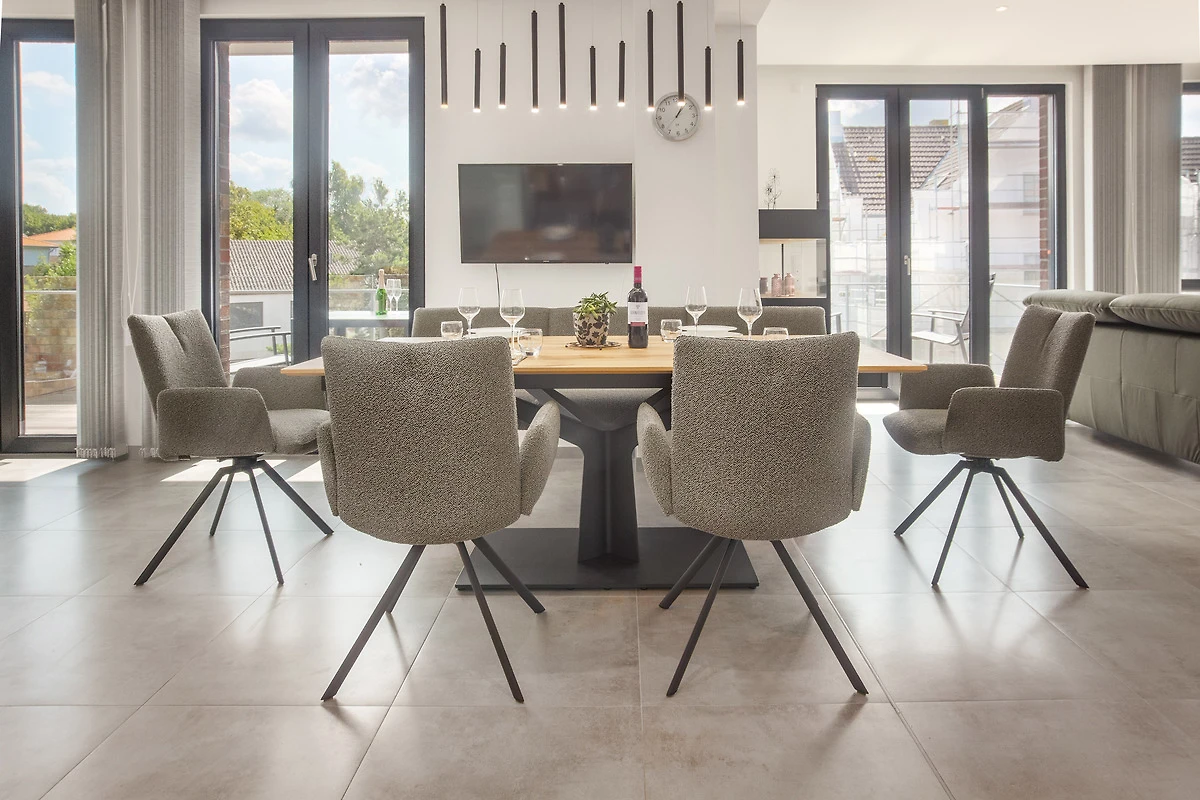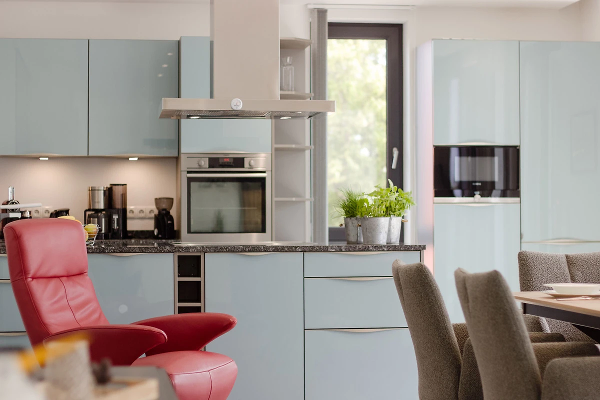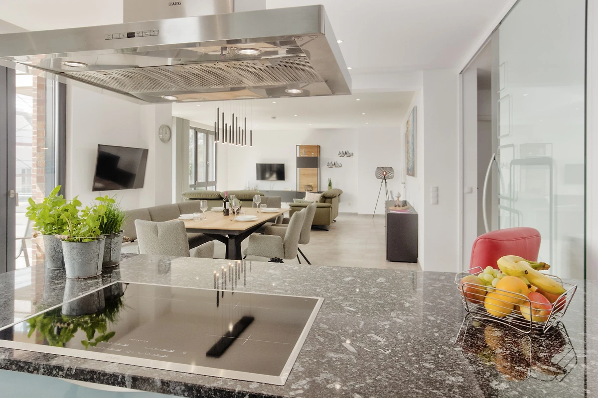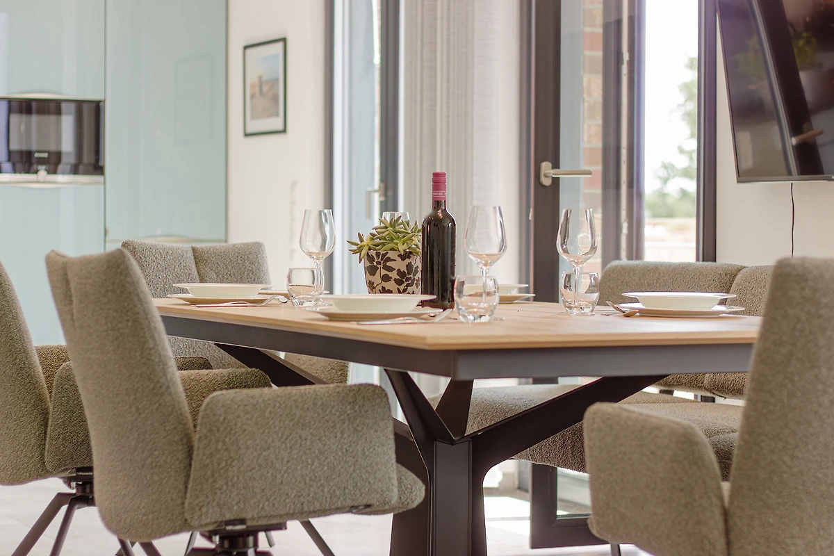 Die offene, voll ausgestattete Küche mit Kochinsel lässt keine Wünsche offen. Kleinere Hilfen sind vorhanden. Ob Snack oder grosses Menü – alles ist möglich. Der angrenzende Essbereich mit ausziehbarem und unterfahrbarem Tisch bietet viel Platz für gesellige Mahlzeiten mit Familie, Freunden oder Urlaubsbekanntschaften.