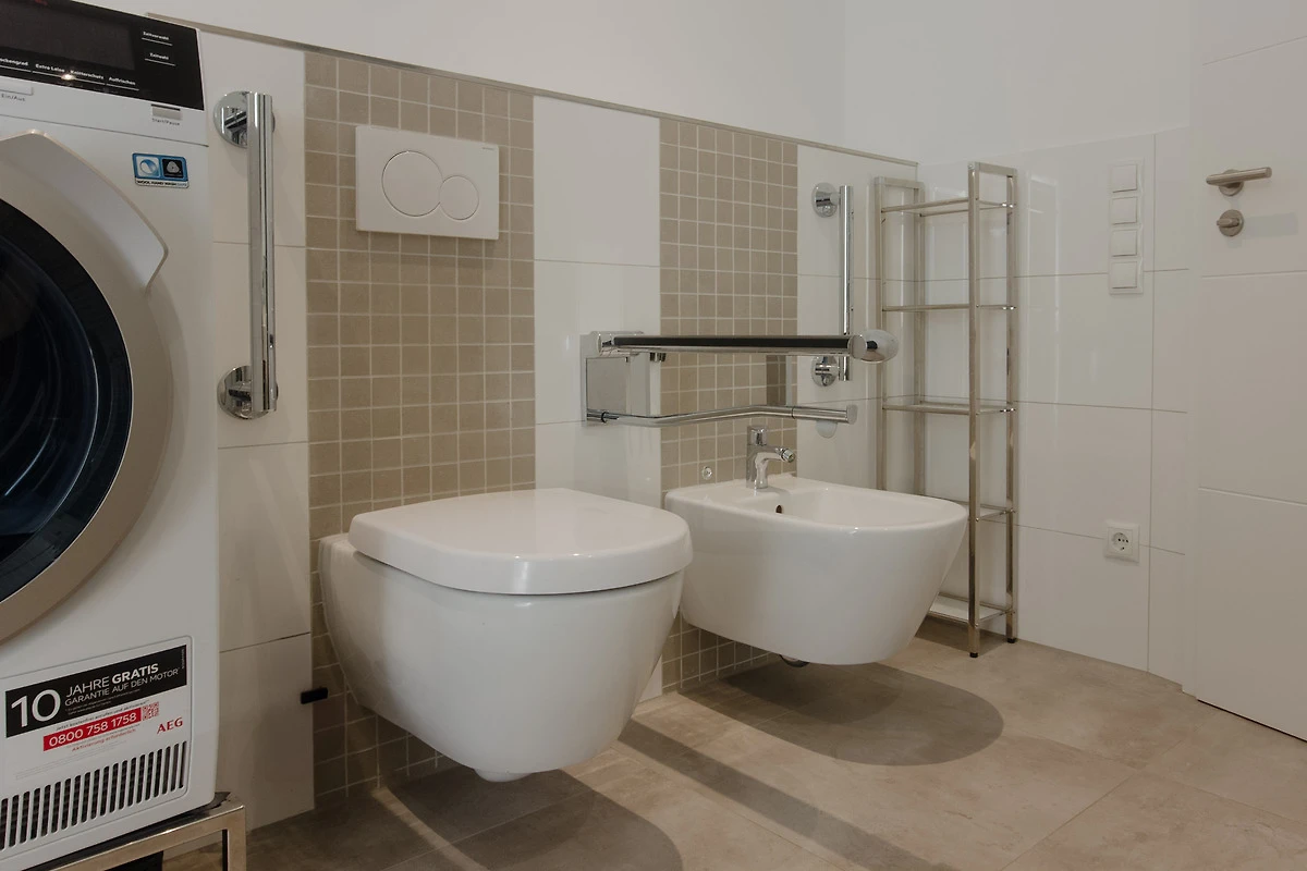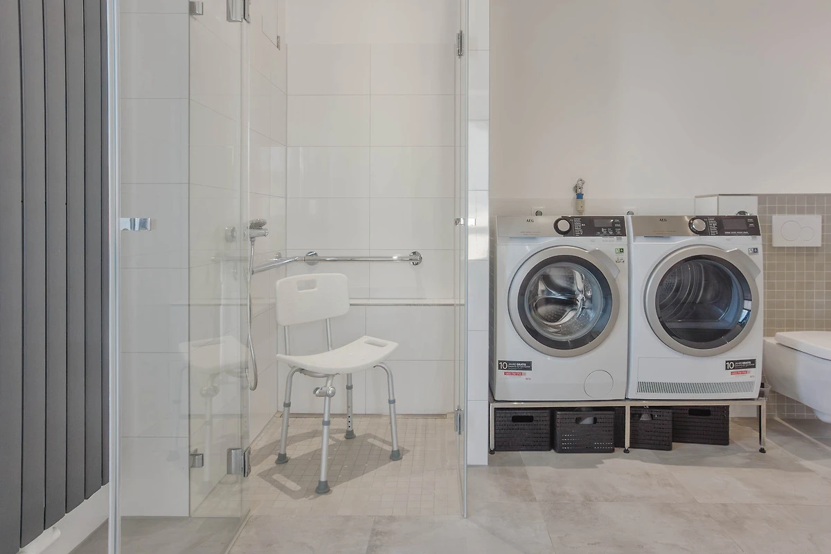 Das komfortable Badezimmer mit Tageslicht verfügt über eine barrierefreie, ebenerdige Dusche, WC und Bidet, beleuchtete Spiegel und Handtuchwärmer. Haltegriffe in der Dusche und beim WC, Duschhocker und ein unterfahrbarer Waschtisch sind praktische Helfer. Eine Waschmaschine und ein Trockner sind hier zudem zur bequemen Nutzung clever integriert. Zusätzlich gibt es in der Unterkunft ein separates Gäste-WC.