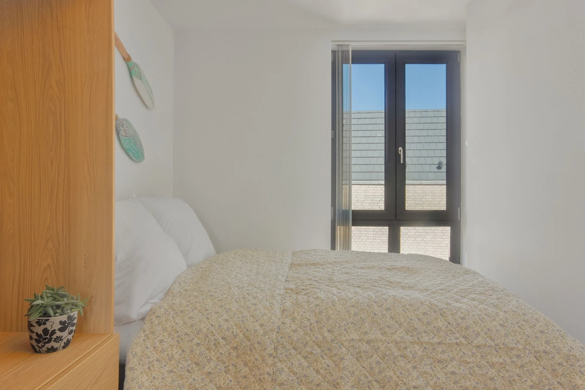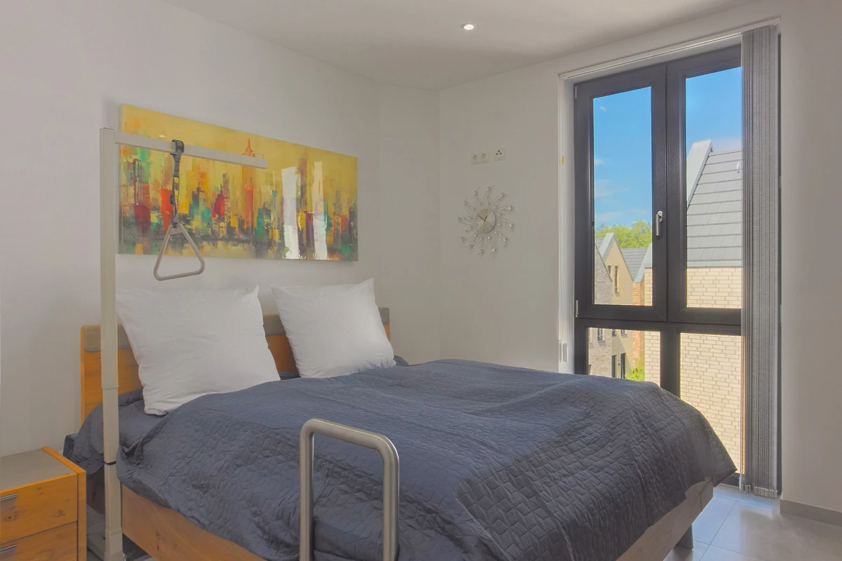 Im Hauptschlafzimmer erwartet Sie ein erhöhtes Doppelbett (180 × 200 cm, Höhe 58 cm) mit Aufstehhilfe sowie ein geräumiger Kleiderschrank. Das zweite Schlafzimmer ist mit einem kleinerem Doppelbett (140 × 200 cm) und kleinem Kleiderschrank ausgestattet. Beide Räume lassen sich mittels Lamellenvorhang abdunkeln bzw. bieten Sichtschutz. Allergiker geeignete Bettwäsche und Handtücher können optional hinzu gebucht werden.