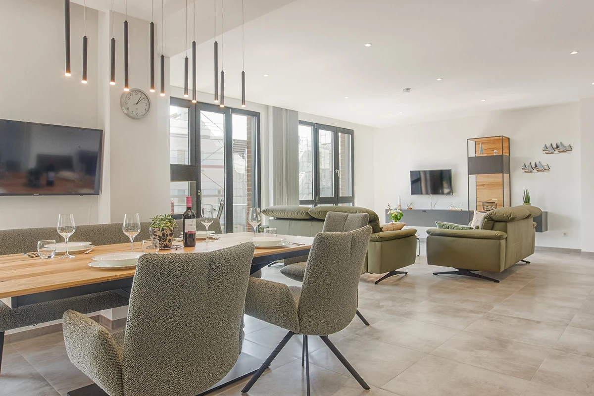 Im geschmackvoll eingerichteten Wohnbereich erwarten Sie zwei bequeme Couches (eine davon mit Schlaffunktion), ein Relax Sessel, Smart-TV, WLAN sowie Streaming-Möglichkeiten. Eine Auswahl an Büchern und Spielen rundet das Unterhaltungsangebot ab – Langeweile kommt hier garantiert nicht auf.