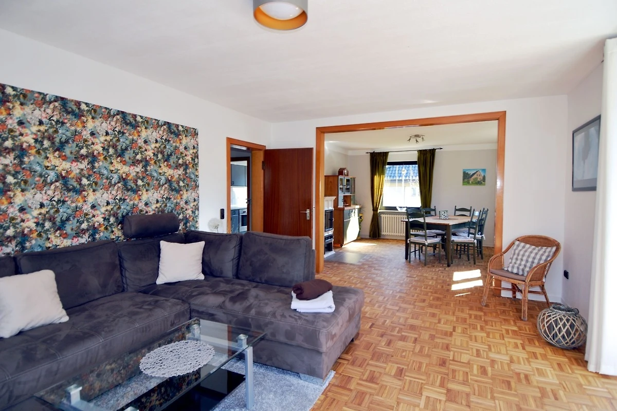 Im Erdgeschoss befindet sich der grosszügig geschnittene Wohn- und Essbereich. Dieser ist mit einer grossen Couch, einem Fernseher sowie einem geräumigen Esstisch ausgestattet. Ein Kaminofen ist vorhanden und kann genutzt werden (kein Holzvorrat). Vom Wohnbereich aus besteht direkter Zugang zur Terrasse, die mit Gartenmöbeln ausgestattet ist und Platz für den Aufenthalt im Freien bietet.