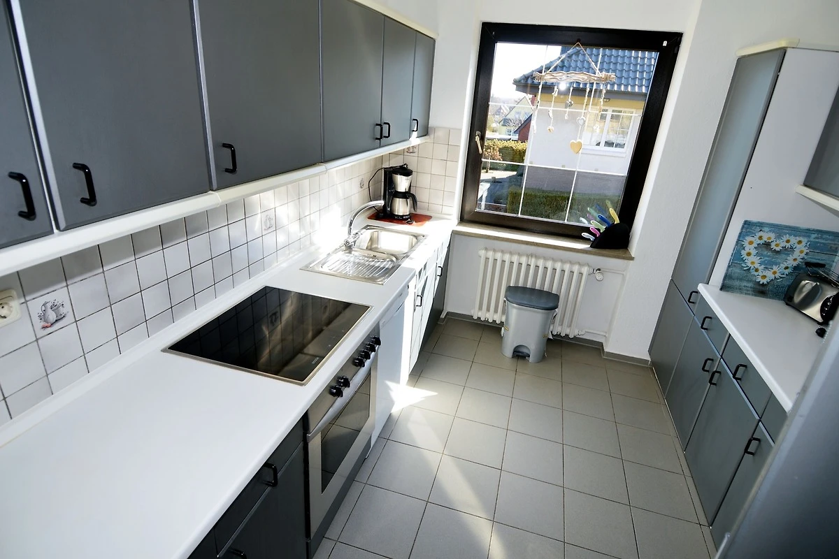 Ebenfalls im Erdgeschoss befinden sich die separate Küche, ein Gäste-WC sowie ein Schlafzimmer mit einem Bett der Grösse 140x200.