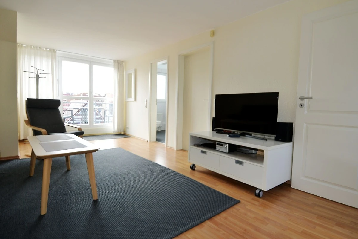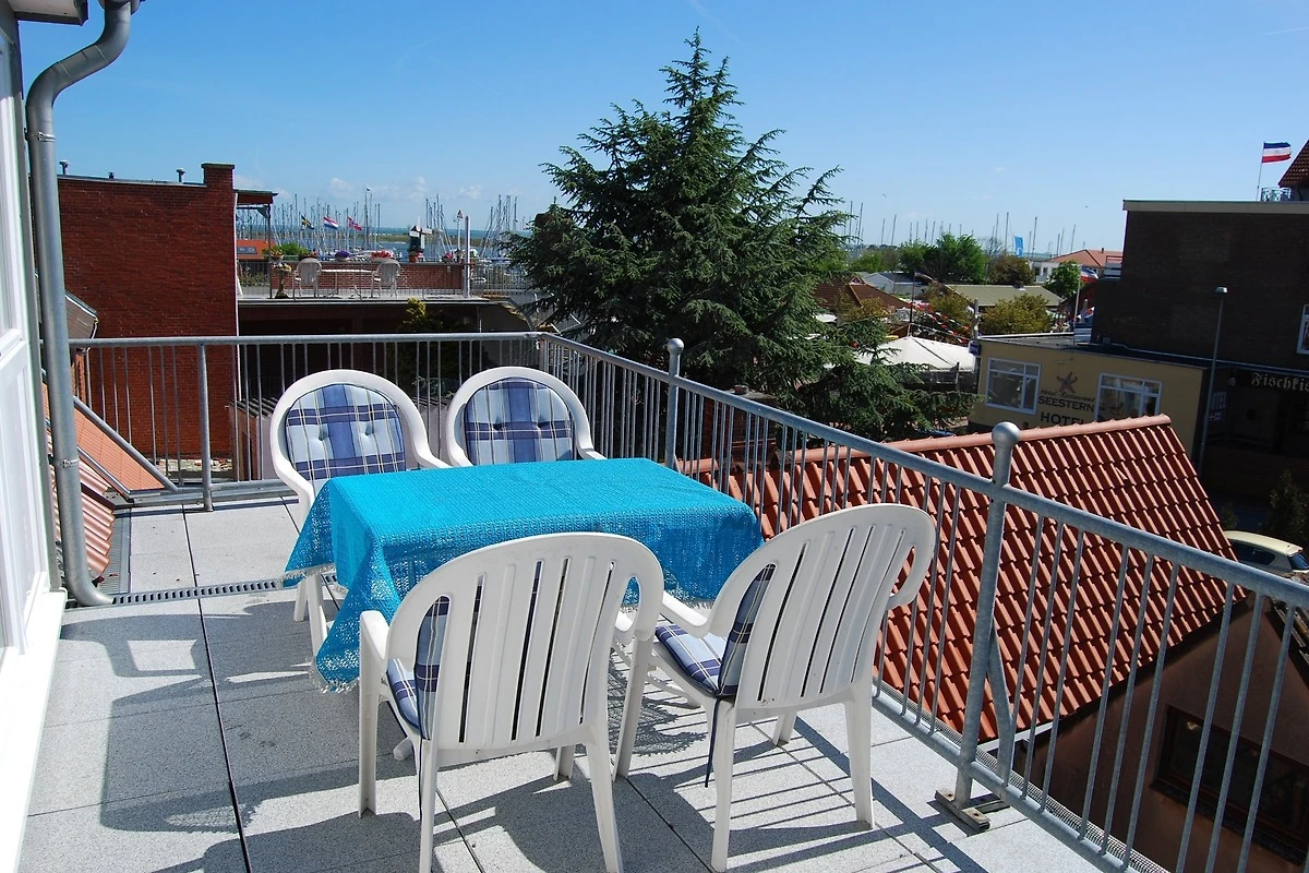 Vom Wohnbereich aus besteht Zugang zum Balkon, der einen Blick in Richtung Hafen ermöglicht. Der Balkon bietet Platz für den Aufenthalt im Freien.