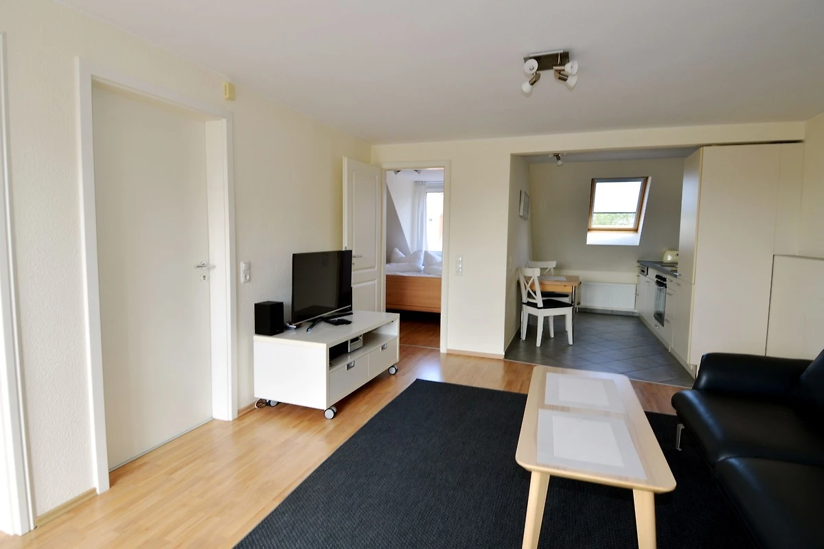Der Wohnbereich ist mit einem Sofa, einem Sessel sowie einem Fernseher eingerichtet. Zusätzlich stehen WLAN / WiFi, Radio und Musikanlage zur Verfügung. Der Raum eignet sich sowohl zum Entspannen als auch für den Aufenthalt in den Abendstunden.