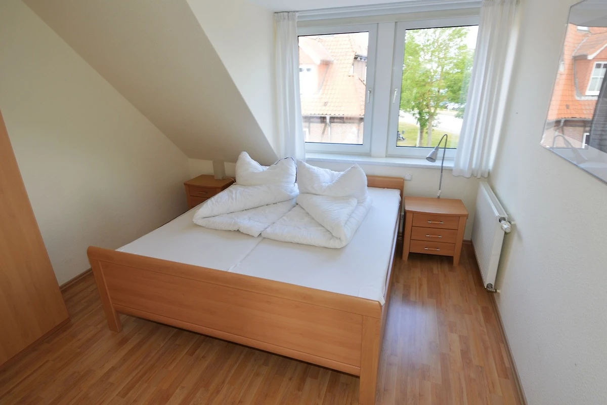 Die Wohnung verfügt über ein separates Schlafzimmer mit Doppelbett und Stauraum für Kleidung. Der Raum ist funktional eingerichtet und bietet eine ruhige Rückzugsmöglichkeit.