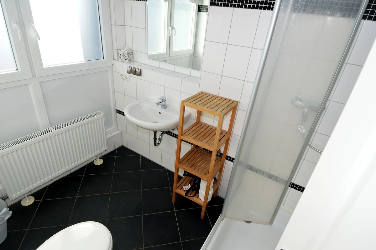 Das Badezimmer ist modern gestaltet und mit Dusche, Waschbecken und WC ausgestattet. Es bietet ausreichend Platz für die tägliche Nutzung.