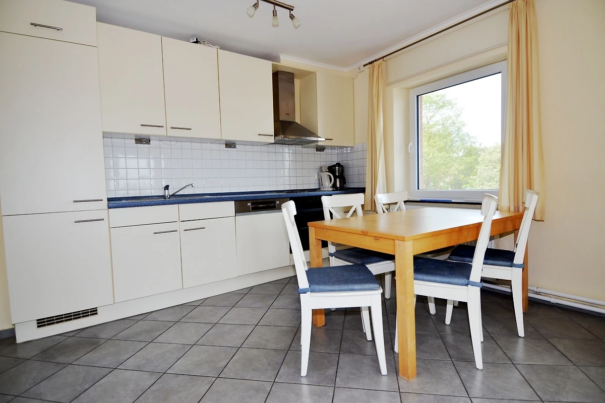 Die funktionale und voll ausgestattete Küche bietet alles, was Sie für die Selbstversorgung im Urlaub benötigen. Der direkt angrenzende Essbereich ist für gemeinsame Mahlzeiten ausgelegt.
