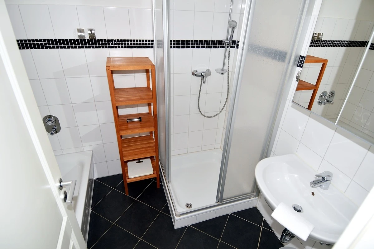 Das Badezimmer ist modern gestaltet und mit Dusche, Waschbecken und WC ausgestattet. Es bietet ausreichend Platz für die tägliche Nutzung.