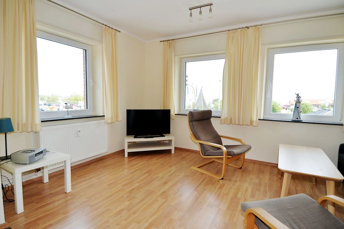 Der Wohnbereich ist mit einem Sofa, zwei Sessel sowie einem Fernseher eingerichtet. Zusätzlich stehen WLAN zur Verfügung. Der Raum eignet sich sowohl zum Entspannen als auch für den Aufenthalt in den Abendstunden.
