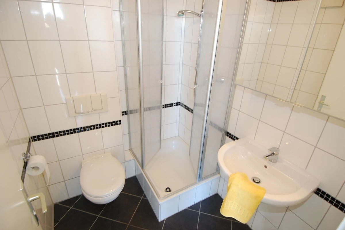 Das Badezimmer ist mit Dusche, Waschbecken und WC ausgestattet.
