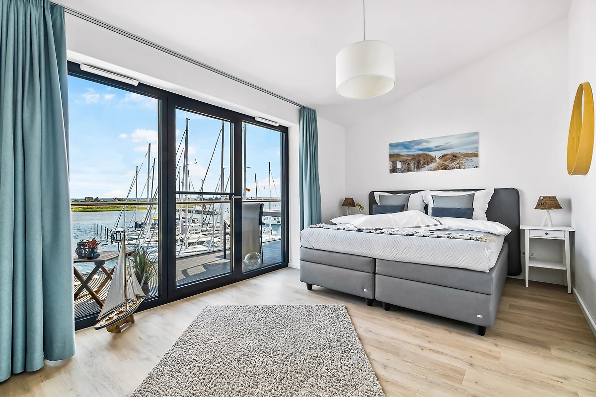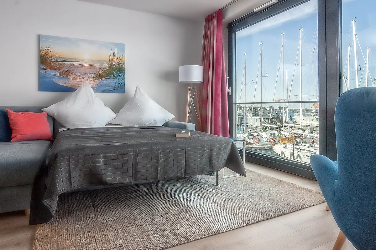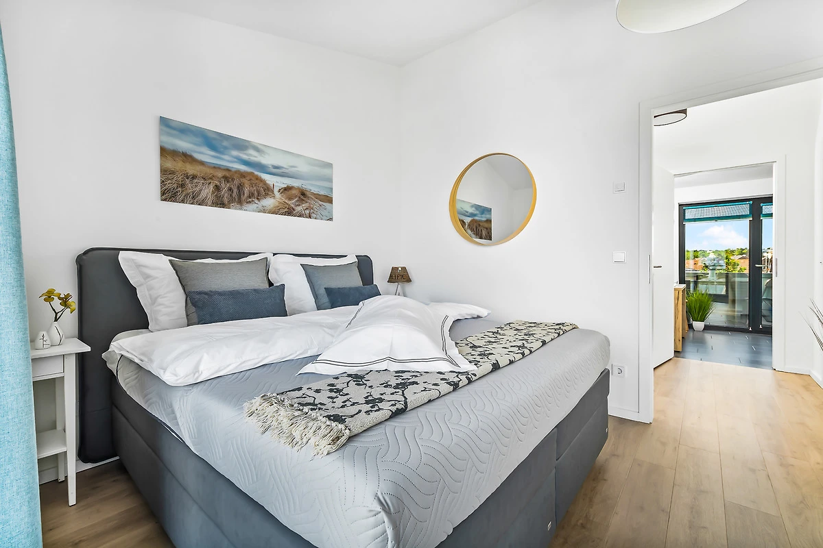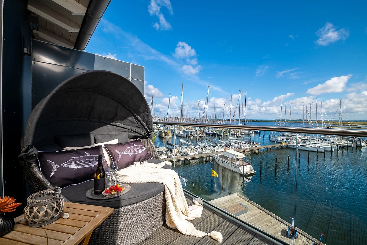 Über eine innenliegende Treppe verbunden, erstreckt sich die moderne Unterkunft über das erste Obergeschoss und das Dachgeschoss. Der grosszügige Wohnbereich begeistert mit seiner hochwertigen Einrichtungslinie, lichtdurchfluteten Räumen und einem einzigartigen Panoramablick auf den Hafen und die Weiten der Ostsee – eine Lage, die kaum zu übertreffen ist. Hier können Sie das maritime Flair hautnah erleben und sich vom beruhigenden Meeresrauschen verzaubern lassen.