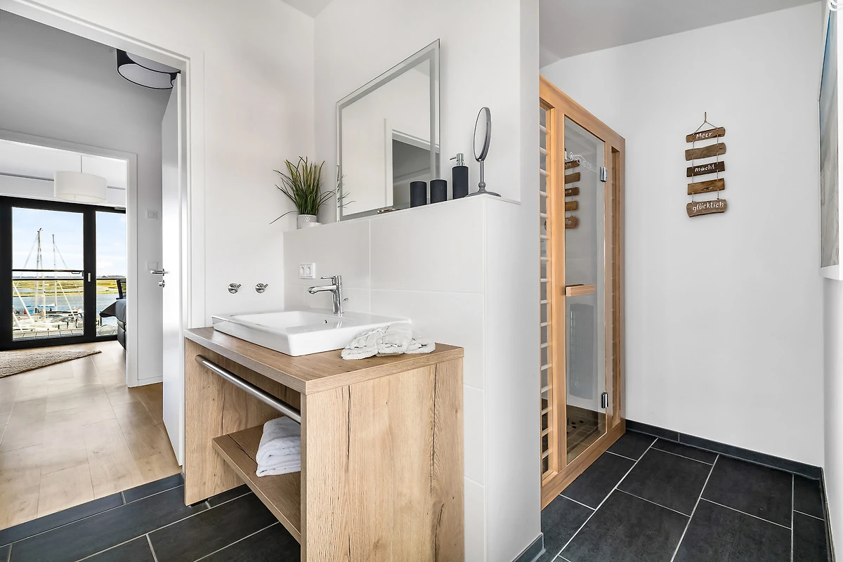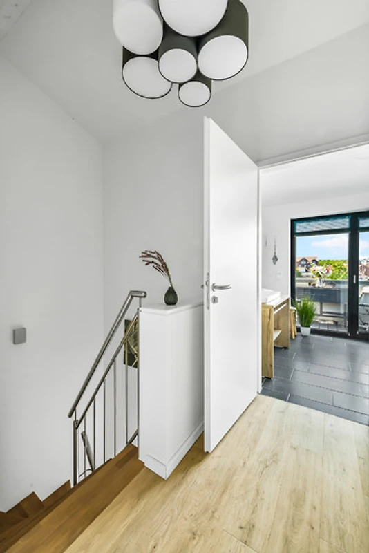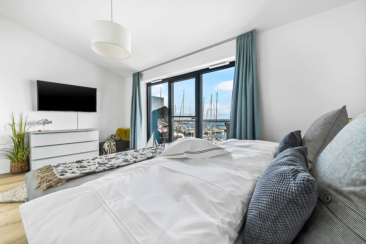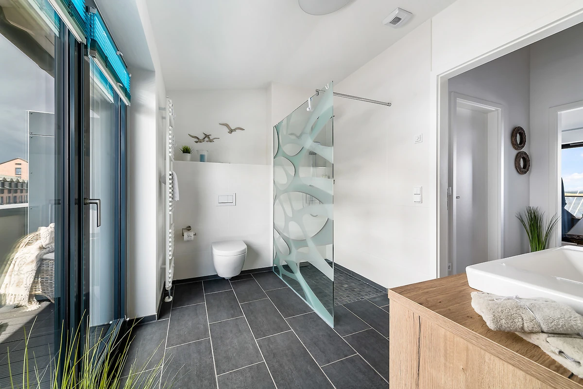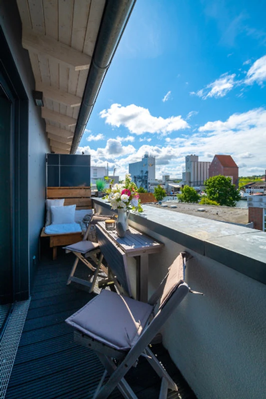 Über eine innenliegende Treppe verbunden, erstreckt sich die moderne Unterkunft über das erste Obergeschoss und das Dachgeschoss. Der grosszügige Wohnbereich begeistert mit seiner hochwertigen Einrichtungslinie, lichtdurchfluteten Räumen und einem einzigartigen Panoramablick auf den Hafen und die Weiten der Ostsee – eine Lage, die kaum zu übertreffen ist. Hier können Sie das maritime Flair hautnah erleben und sich vom beruhigenden Meeresrauschen verzaubern lassen.