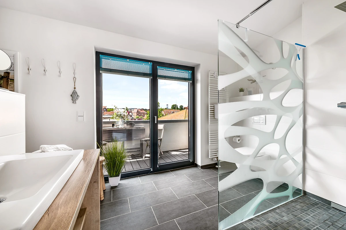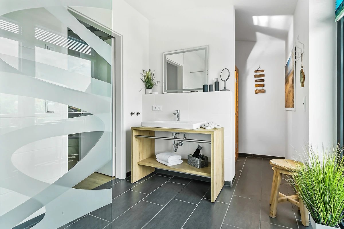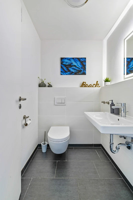 Das grosszügige Badezimmer überzeugt mit einer ebenerdigen Dusche, einem Handtuchwärmer und stilvollen Details, die für höchsten Komfort sorgen. Ein separates Gäste-WC bietet zusätzliche Annehmlichkeiten, sodass Sie sich rundum wohlfühlen können.