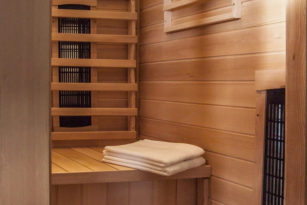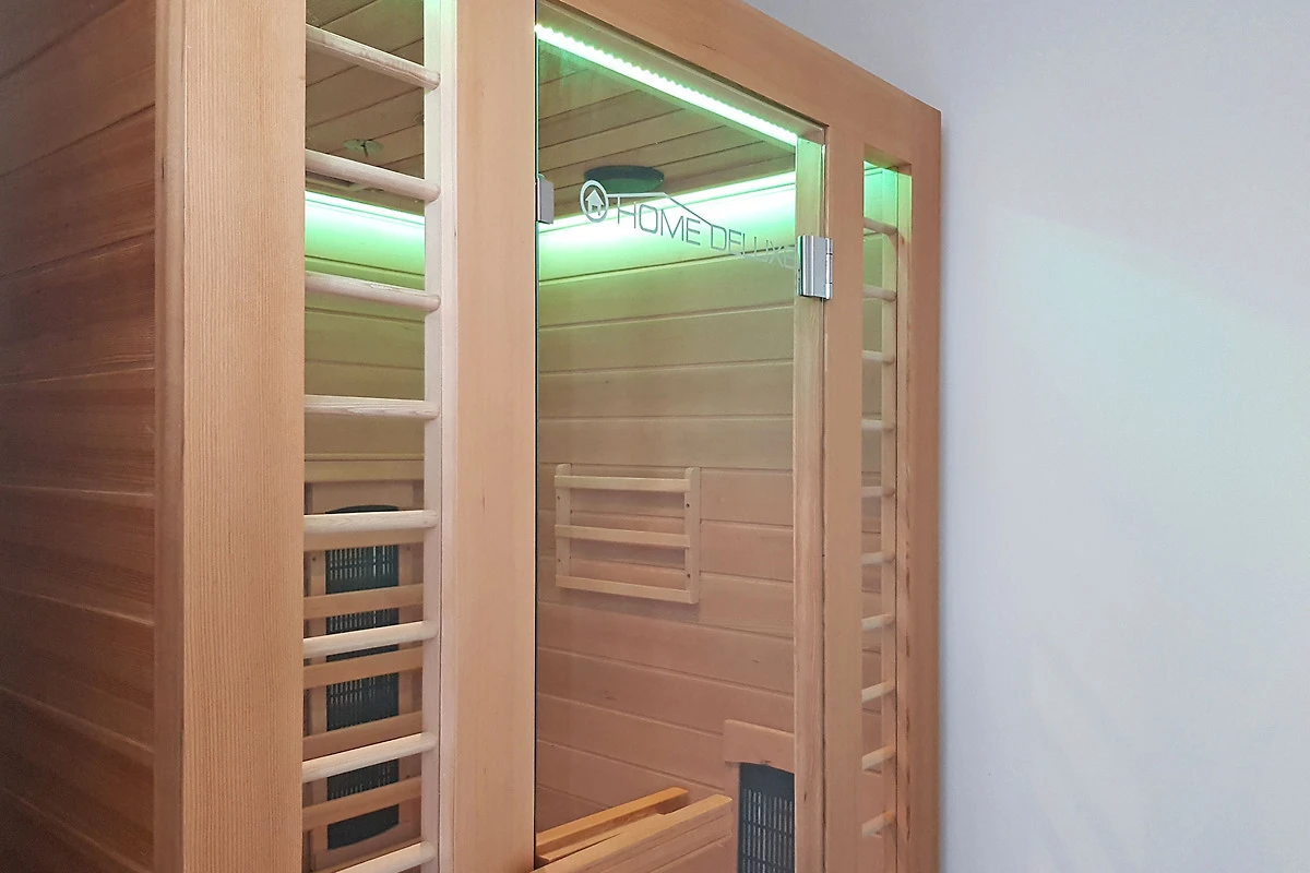 Der offene Wohnbereich lädt mit seiner gemütlichen Couch, modernen Unterhaltungsmöglichkeiten wie Smart-TV und WLAN sowie einer integrierten Infrarot-Sauna zu entspannten Momenten ein. Ob nach einem langen Strandspaziergang oder an kühleren Tagen – die Sauna bietet pure Erholung und trägt zu Ihrem Wohlbefinden bei.