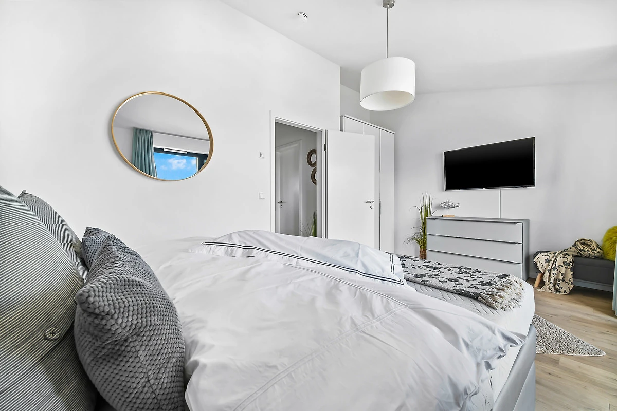 Die Wohnung bietet Platz für bis zu vier Personen und eignet sich ideal für Paare oder kleine Familien. Das stilvoll eingerichtete Schlafzimmer im Dachgeschoss ist mit einem komfortablen Doppelboxspringbett und eigenem TV ausgestattet und sorgt für erholsame Nächte. Im Wohnbereich steht zusätzlich eine hochwertige Schlafcouch mit einer Liegefläche von 1,40 x 2,00 m zur Verfügung, die weiteren Gästen angenehme Ruhe bietet.