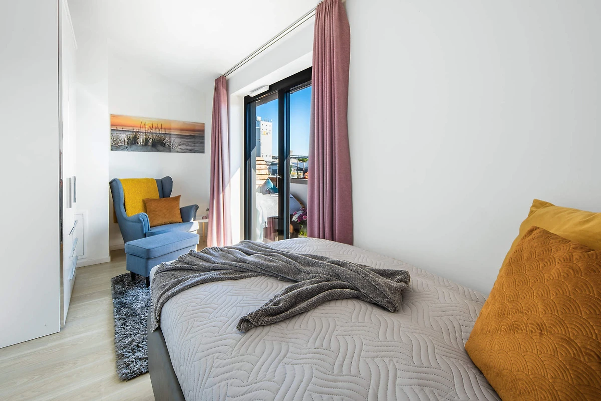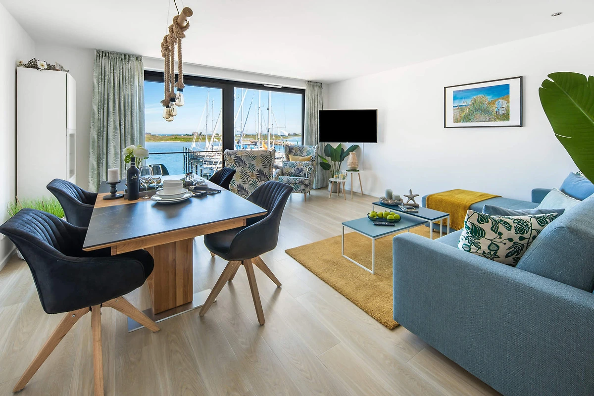 Auf rund 90 m² erstreckt sich diese stilvolle Unterkunft über zwei Ebenen, das 1. Obergeschoss und das Dachgeschoss, verbunden durch eine elegante Innentreppe. Der lichtdurchflutete Wohnbereich mit hochwertiger Einrichtung begeistert mit einem atemberaubenden Panoramablick auf den Jachthafen und die Ostsee. Näher am Wasser kann man kaum Urlaub machen.