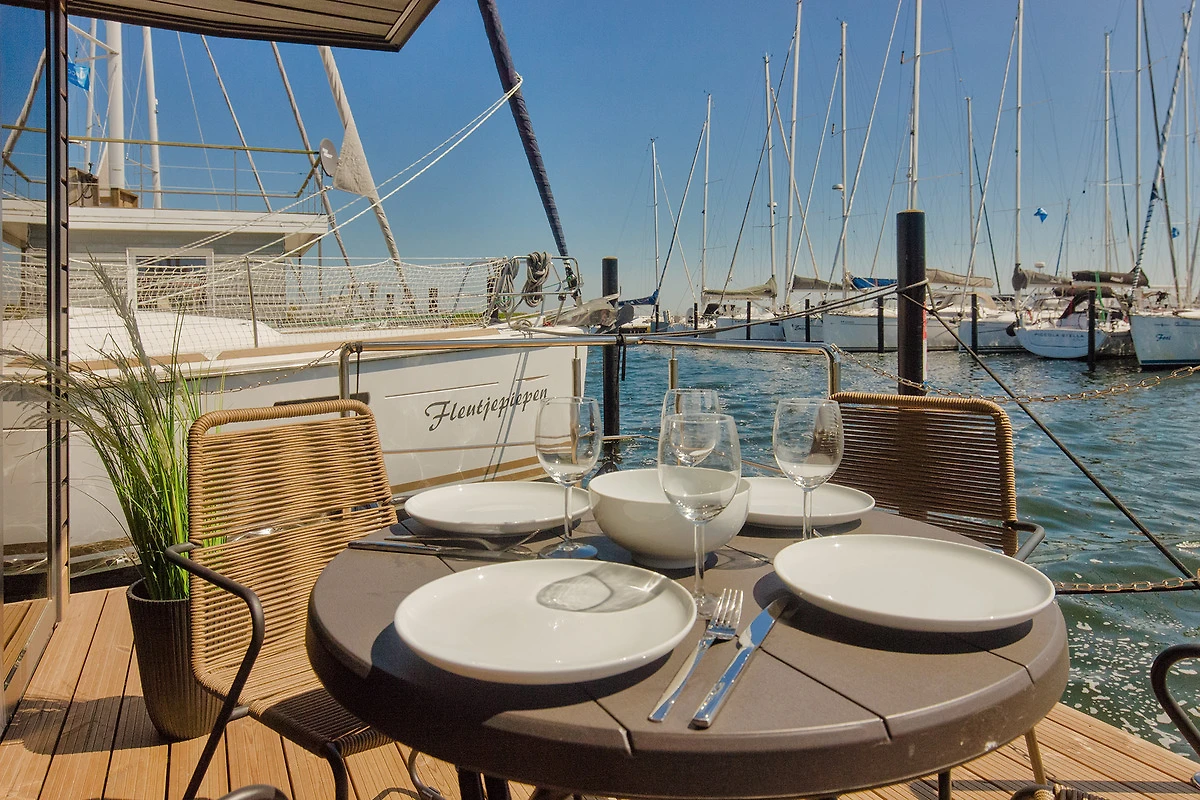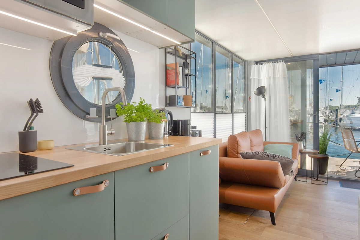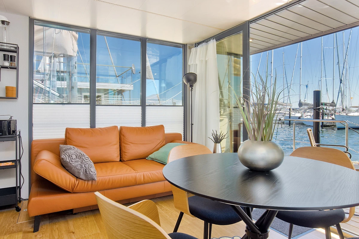 Zur weiteren Gemütlichkeit verfügt das Hausboot selbstverständlich über eine Heizung und teilweise auch Fussbodenheizung. Der vielseitige Essbereich und die offene Küchenzeile mit Induktions-Kochfeld (2 Platten) stehen zur kulinarischen Entfaltung bereit. Dabei müssen Sie auf Ausblick nicht verzichten.