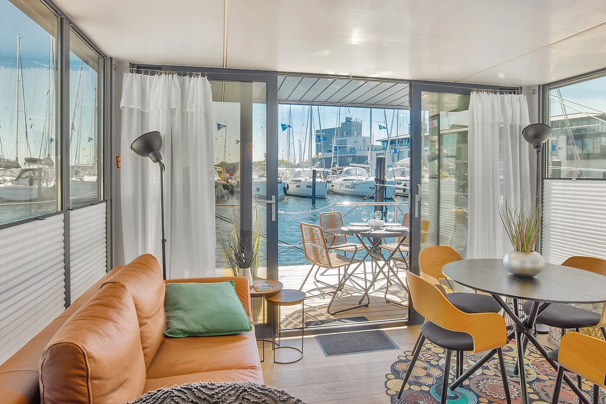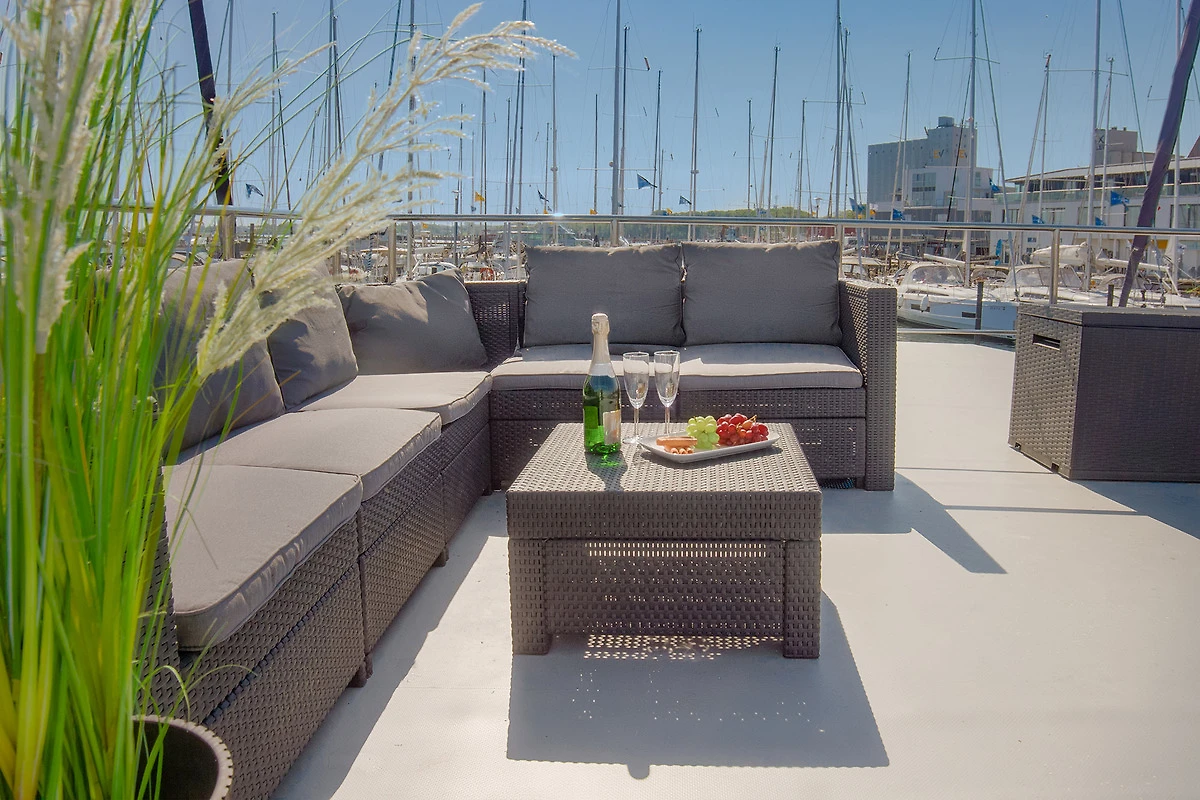 Das exklusive Hausboot Kleine Auszeit mit ca. 32 m² Wohnfläche, separater Bio-Sauna (bis 70°C) und zusätzlich eine möblierte Dachterrasse mit Strandkorb als Sonnendeck, verbunden über eine aussenliegende Treppe. Der moderne und konzipierte Wohnbereich bietet Ihnen einen fantastischen Panoramablick über den Jachthafen und vom Sonnendeck über die Ostsee. Näher am Wasser kann man nicht Urlaub machen!