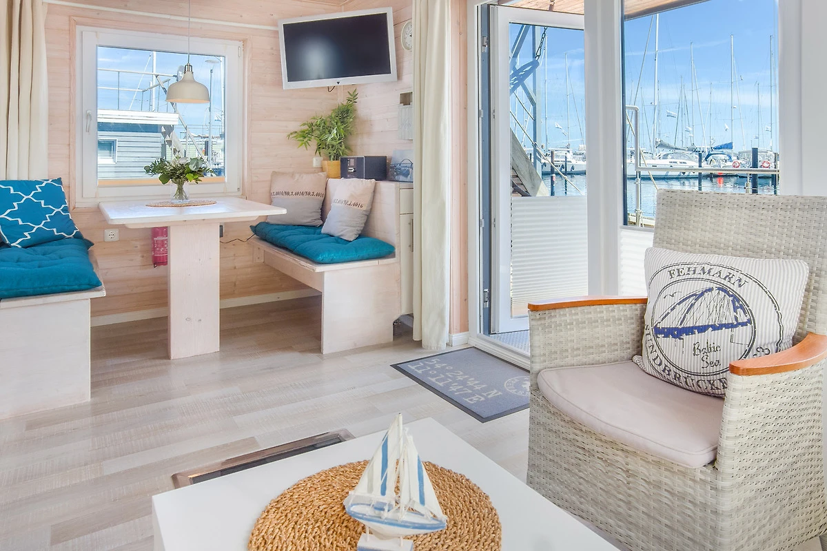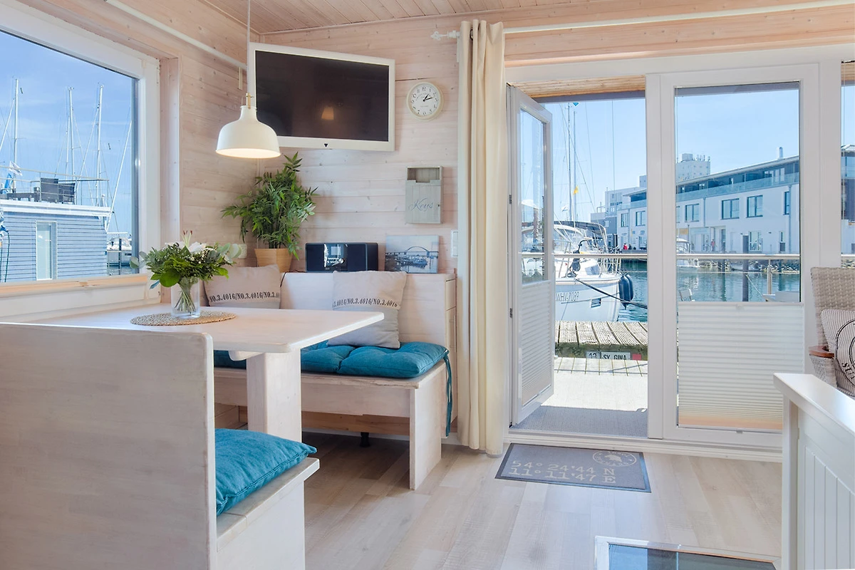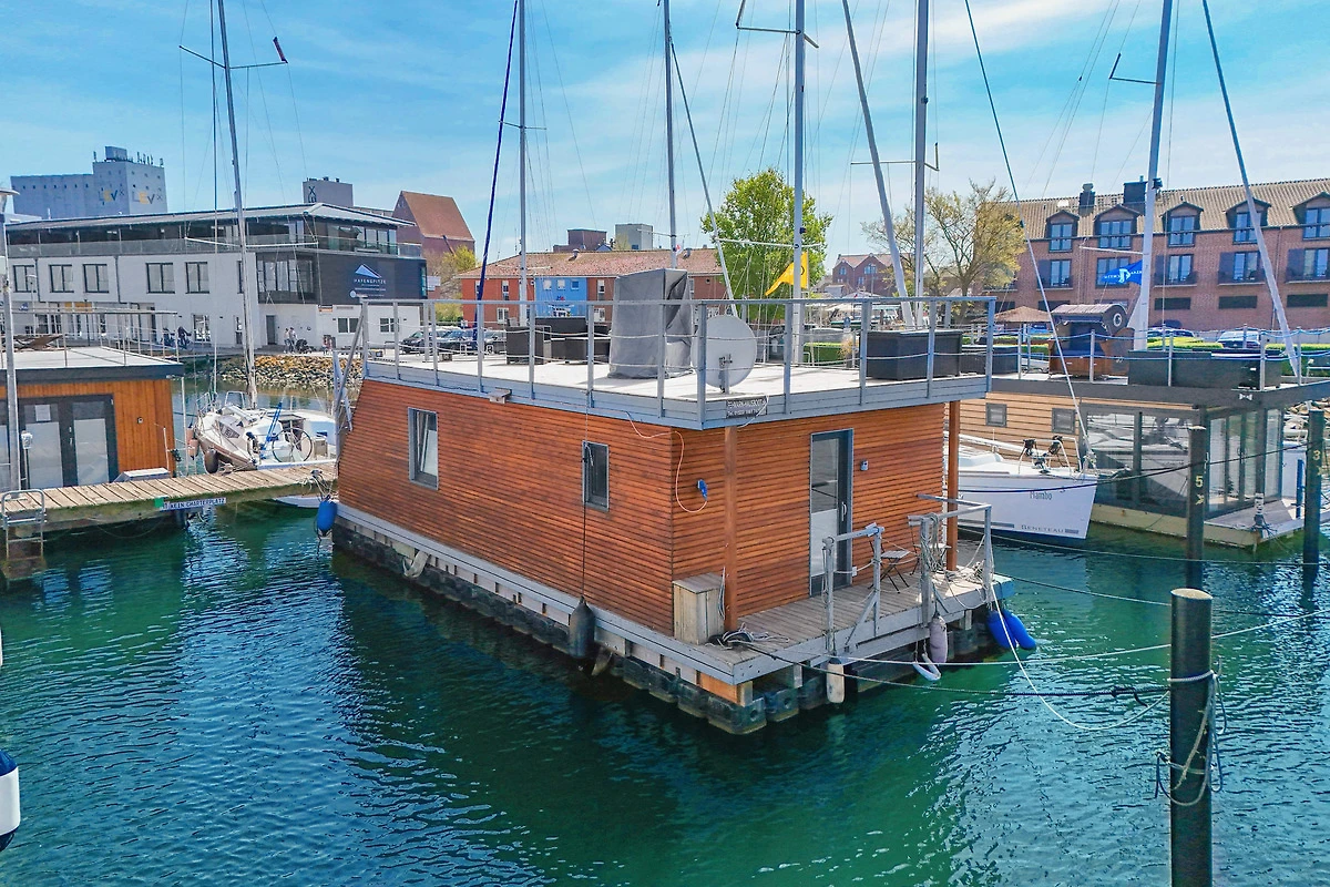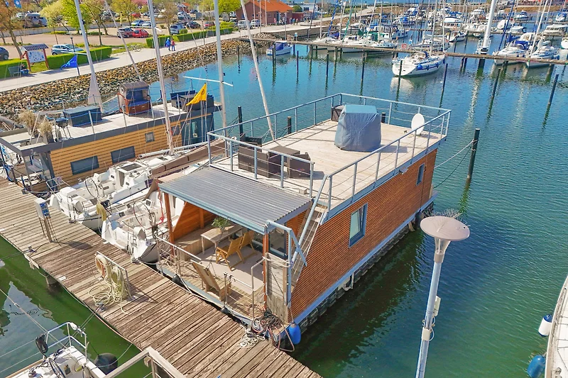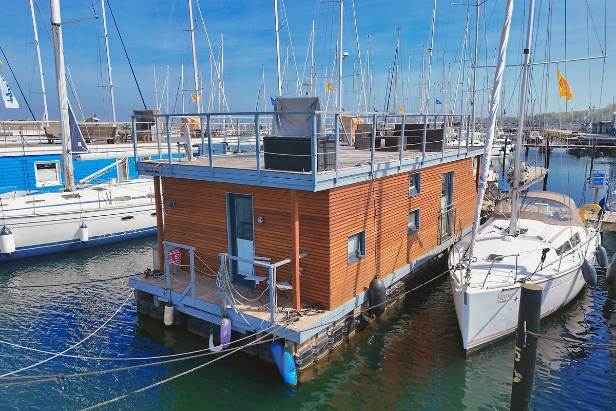 Auf zwei Ebenen erstreckt sich dieses exklusive Hausboot Stina auf ca. 25 m² Wohnfläche und zusätzlich die möblierte Dachterrasse als Sonnendeck, verbunden über eine aussenliegende Treppe. Der moderne und konzipierte Wohnbereich bietet Ihnen einen fantastischen Panoramablick über den Jachthafen und vom Sonnendeck über die Ostsee. Näher am Wasser kann man nicht Urlaub machen!