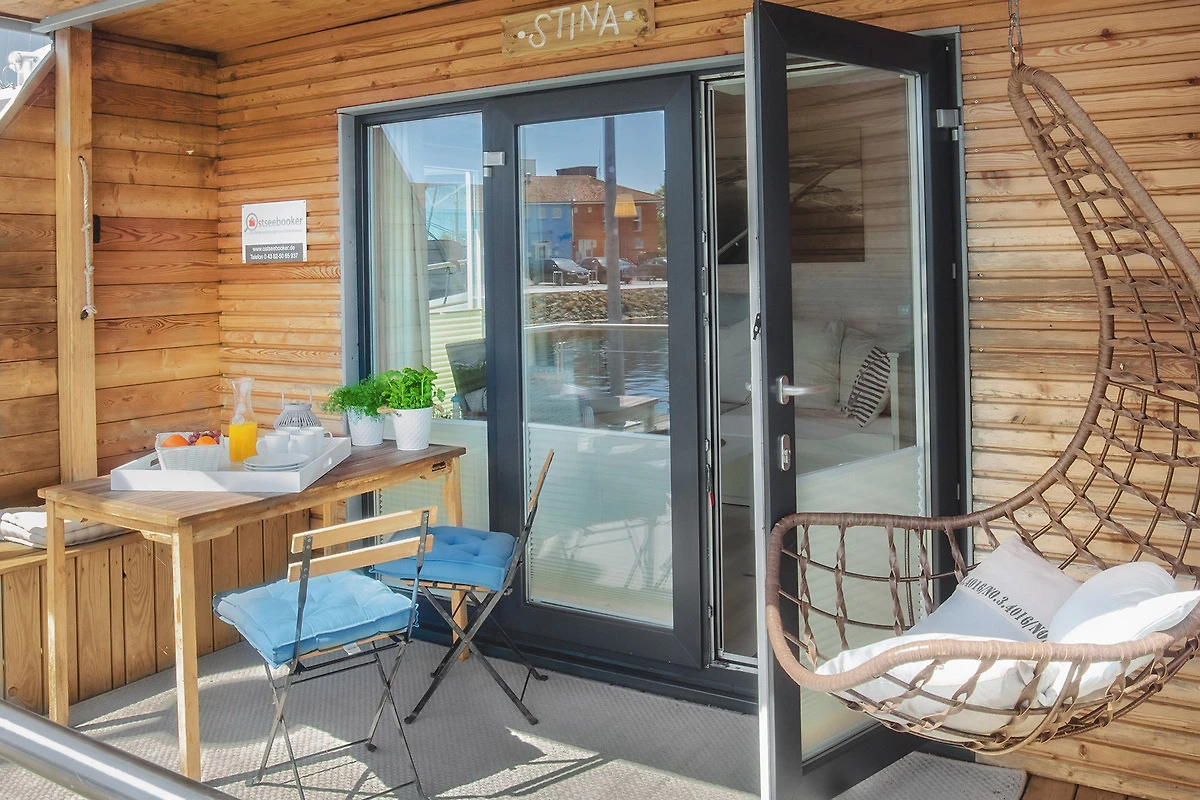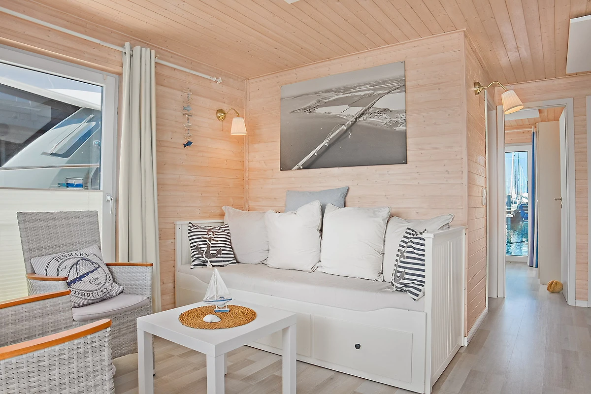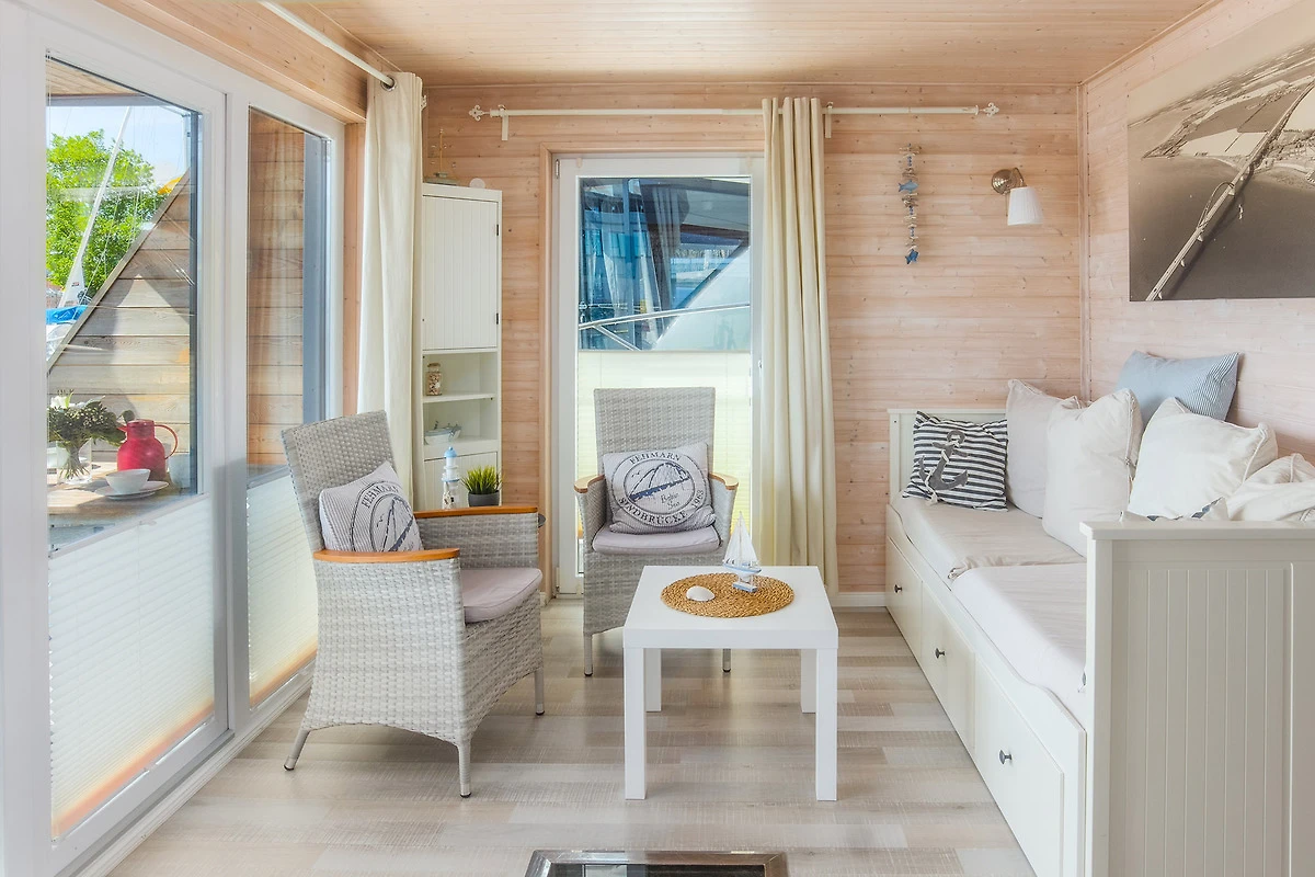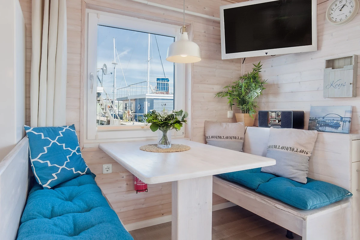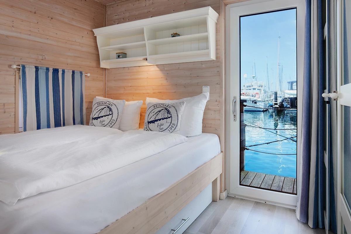 Auf zwei Ebenen erstreckt sich dieses exklusive Hausboot Stina auf ca. 25 m² Wohnfläche und zusätzlich die möblierte Dachterrasse als Sonnendeck, verbunden über eine aussenliegende Treppe. Der moderne und konzipierte Wohnbereich bietet Ihnen einen fantastischen Panoramablick über den Jachthafen und vom Sonnendeck über die Ostsee. Näher am Wasser kann man nicht Urlaub machen!
