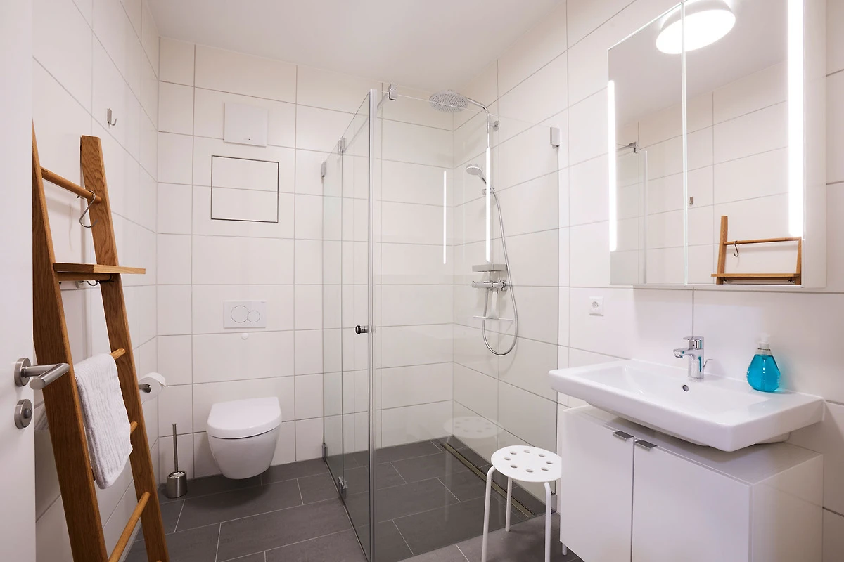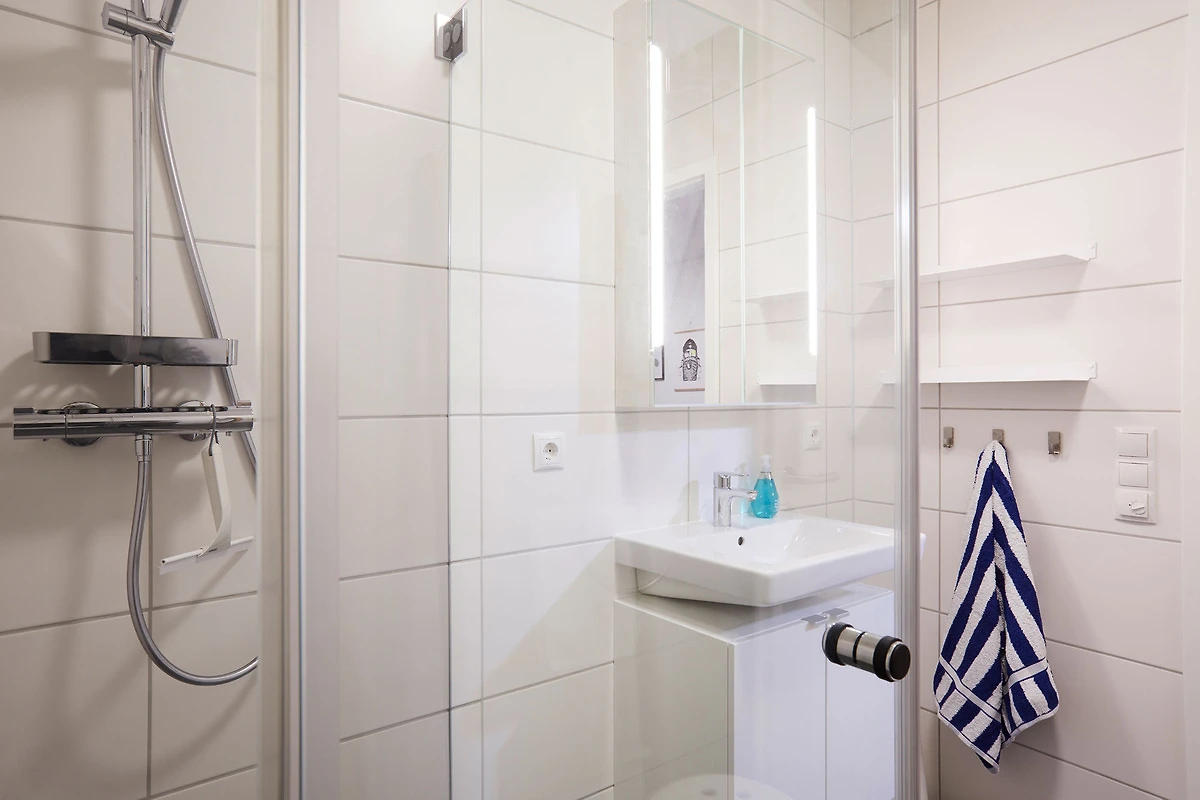 Das moderne Badezimmer ist mit einer grosszügigen, ebenerdigen Rainshower-Dusche, einem Waschbecken und einem WC ausgestattet. Nach einem erlebnisreichen Tag an der Ostsee können Sie sich hier wunderbar erfrischen und entspannen.