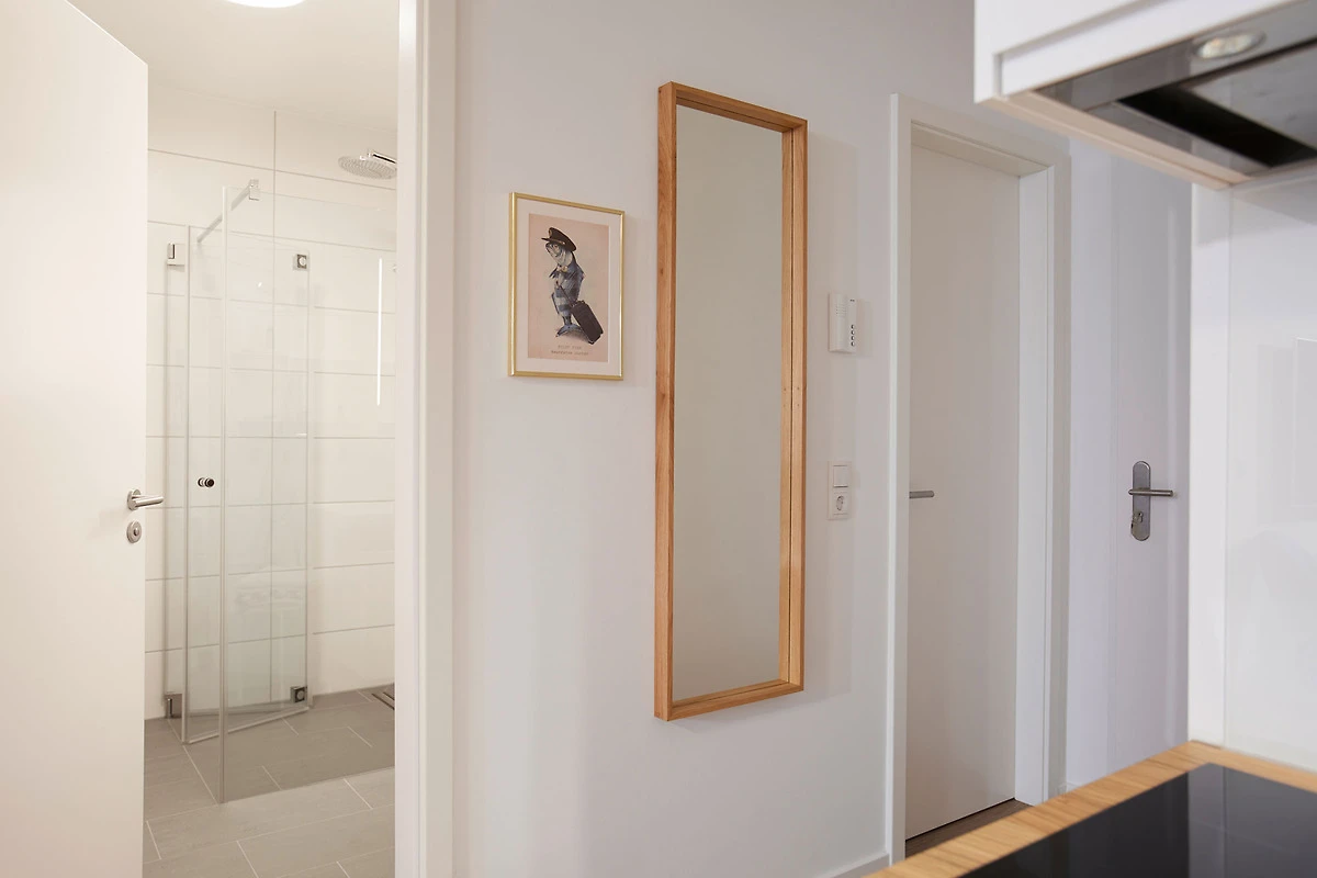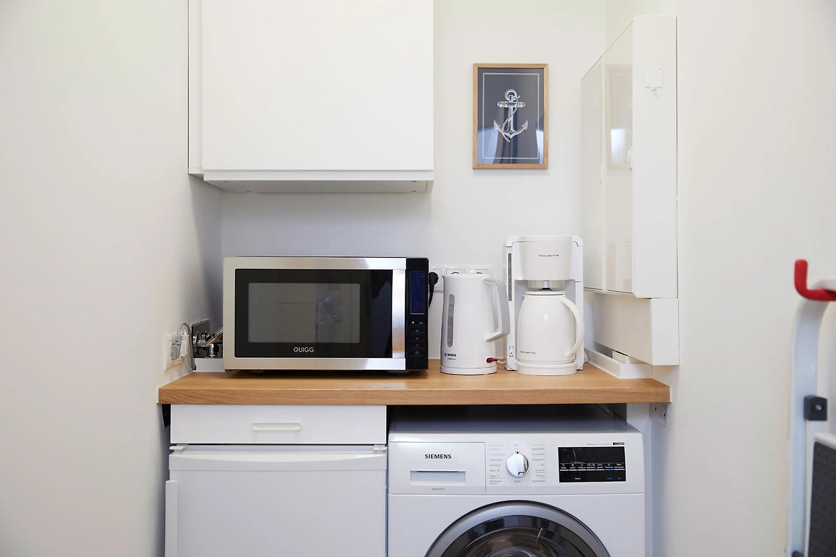 Die Ferienwohnung bietet eine praktische "Back-Kitchen" mit Kühlschrank, Grill-Mikrowelle, Waschtrockner und Staubsauger, die gleichzeitig den Übergang zum offenen Küchenbereich bildet. Dieser ist mit einem Geschirrspüler, Induktionsherd und einem Minigrill für den Balkon bestens ausgestattet, sodass auch im Urlaub für kulinarischen Genuss gesorgt ist. Der angrenzende Essbereich lädt zu gemeinsamen Mahlzeiten und geselligen Abenden ein.