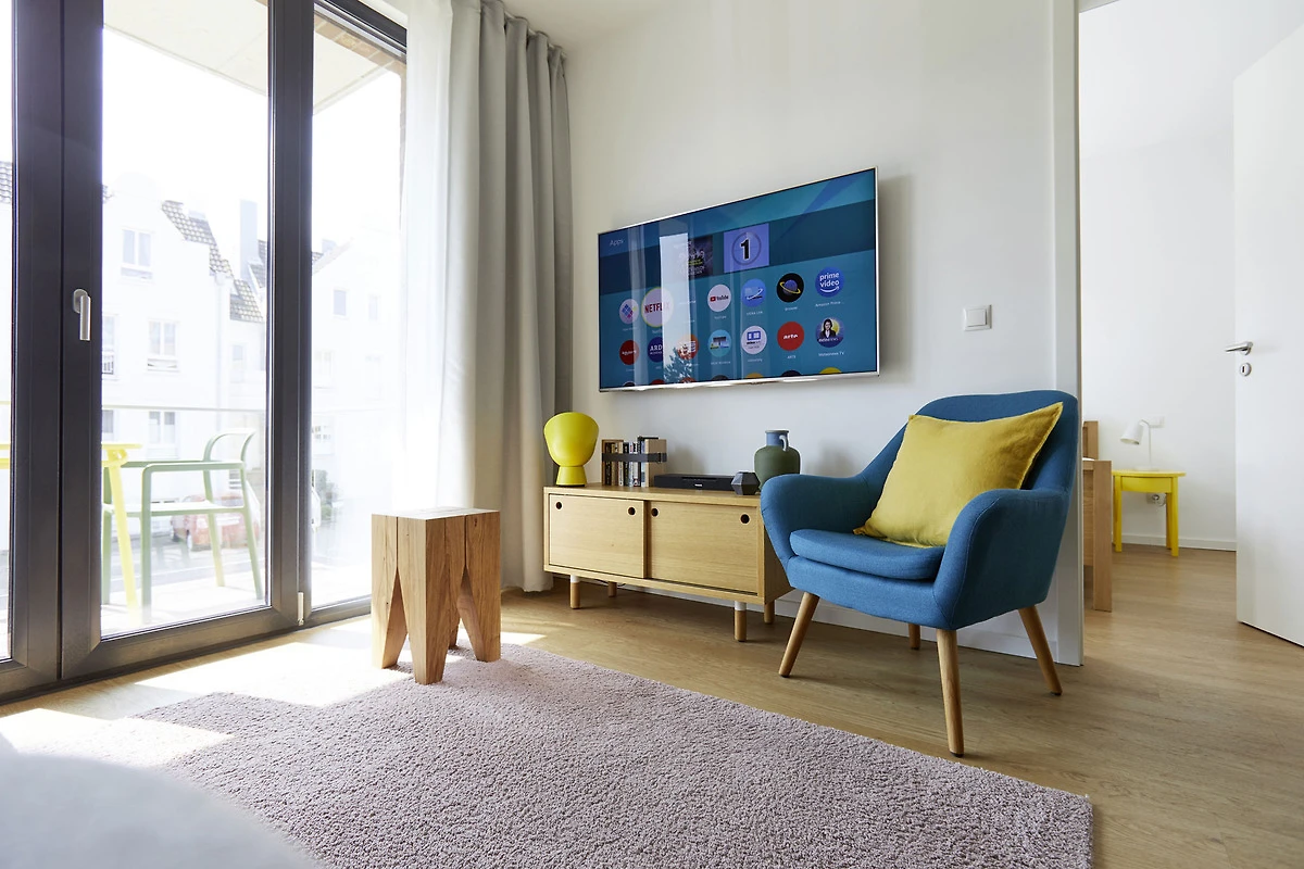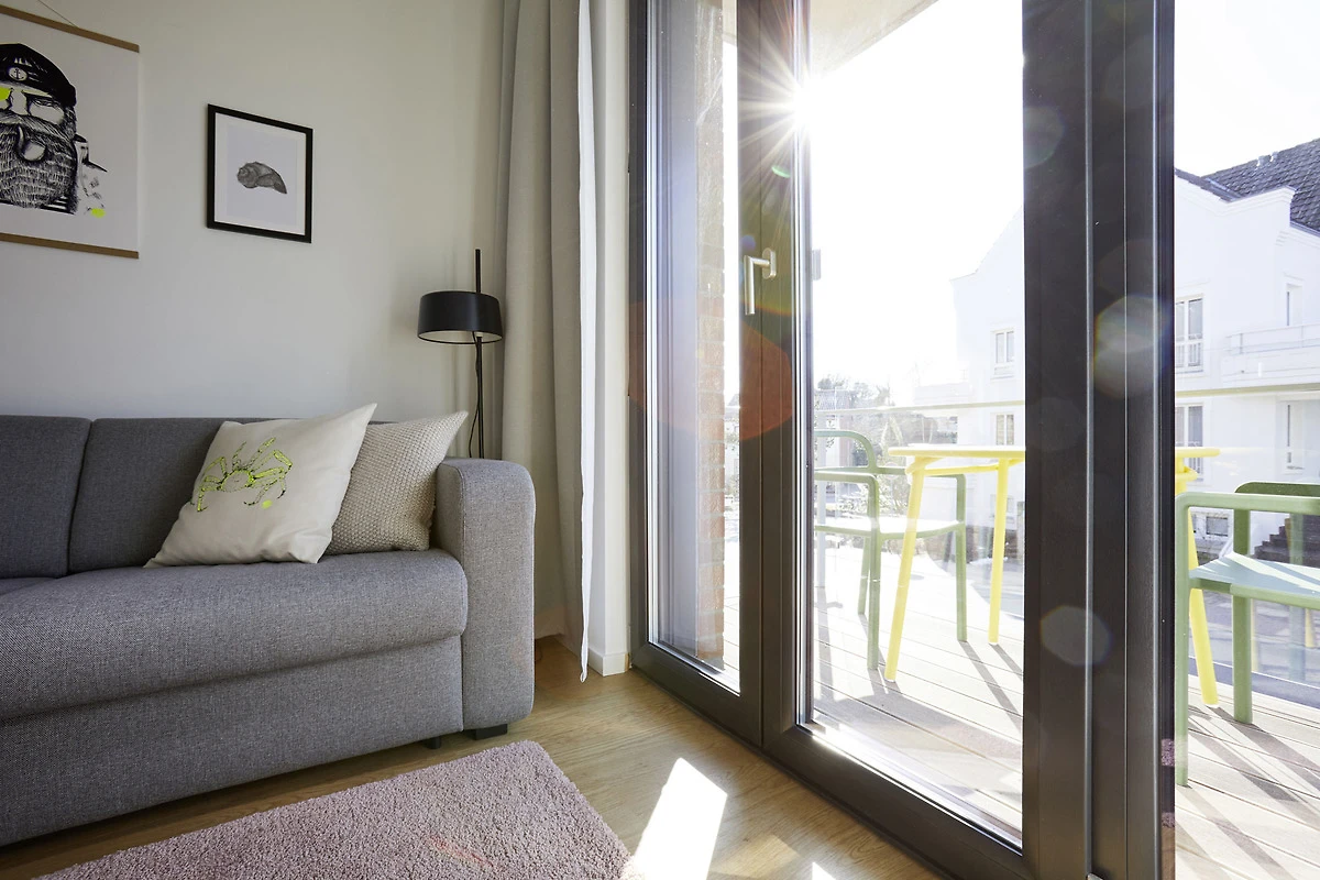 Der geschmackvoll gestaltete Wohnbereich lädt mit einer gemütlichen Couch (mit Schlaffunktion für eine dritte und vierte Person) und einem bequemen Sessel zum Entspannen ein. Zur Unterhaltung stehen Smart-TV, Blu-Ray-Player, Musikanlage und WLAN zur Verfügung, sodass Sie auch im Urlaub Ihre Lieblingsserien oder Filme streamen können. Dank der bodentiefen Fenster ist der Raum lichtdurchflutet und bietet direkten Zugang zum möblierten Süd-Balkon, auf dem Sie die Sonne geniessen oder das Treiben in der Umgebung beobachten können. Die gesamte Wohnung ist mit Fussbodenheizung ausgestattet, sodass Sie sich auch an kühleren Tagen rundum wohlfühlen.