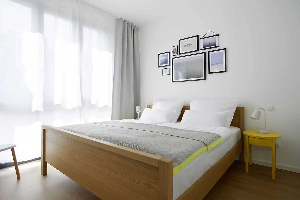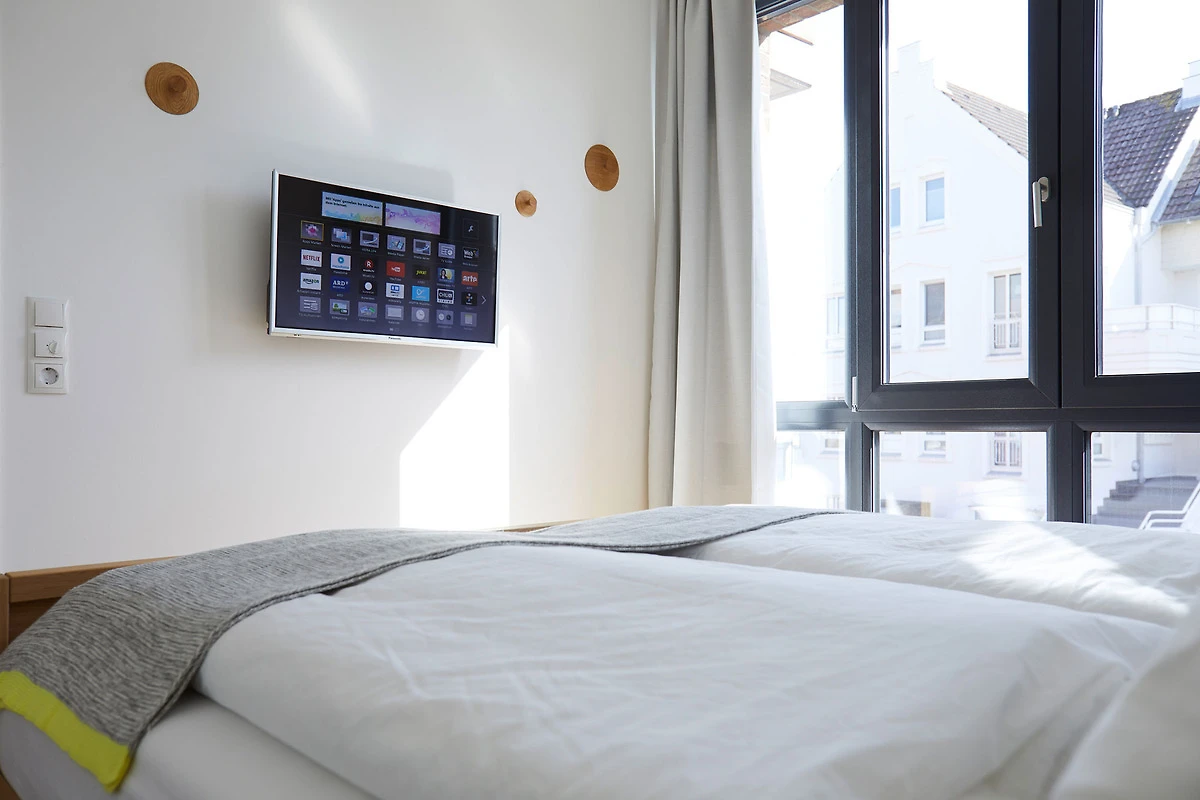 Die Ferienwohnung verfügt über ein separates Schlafzimmer mit komfortablem Doppelbett und eigenem TV, während die Schlafcouch im Wohnbereich als weitere Schlafmöglichkeit dient. Für optimalen Schlafkomfort sorgen blickdichte Vorhänge und elektrische Aussenrollos, die für Dunkelheit und Ruhe in der Nacht sorgen. Allergikerfreundliche Bettwäsche, Handtuchsets und ein Babyreisebett können bei Bedarf gegen eine Gebühr ausgeliehen werden, während ein Hochstuhl im Keller bereitsteht.