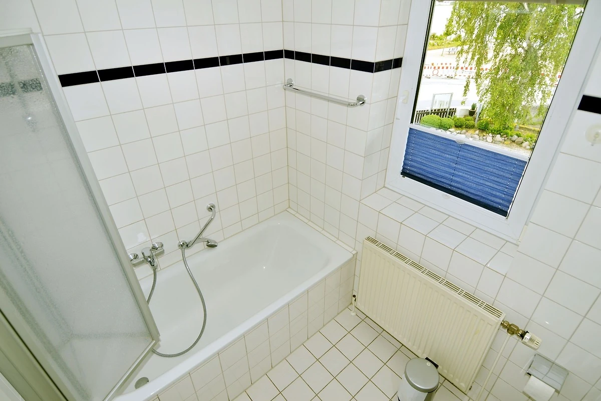 Das Badezimmer ist gepflegt und funktional gestaltet und verfügt über eine Badewanne sowie ein Waschbecken – ideal für entspannte Momente nach einem langen Spaziergang oder Strandtag.