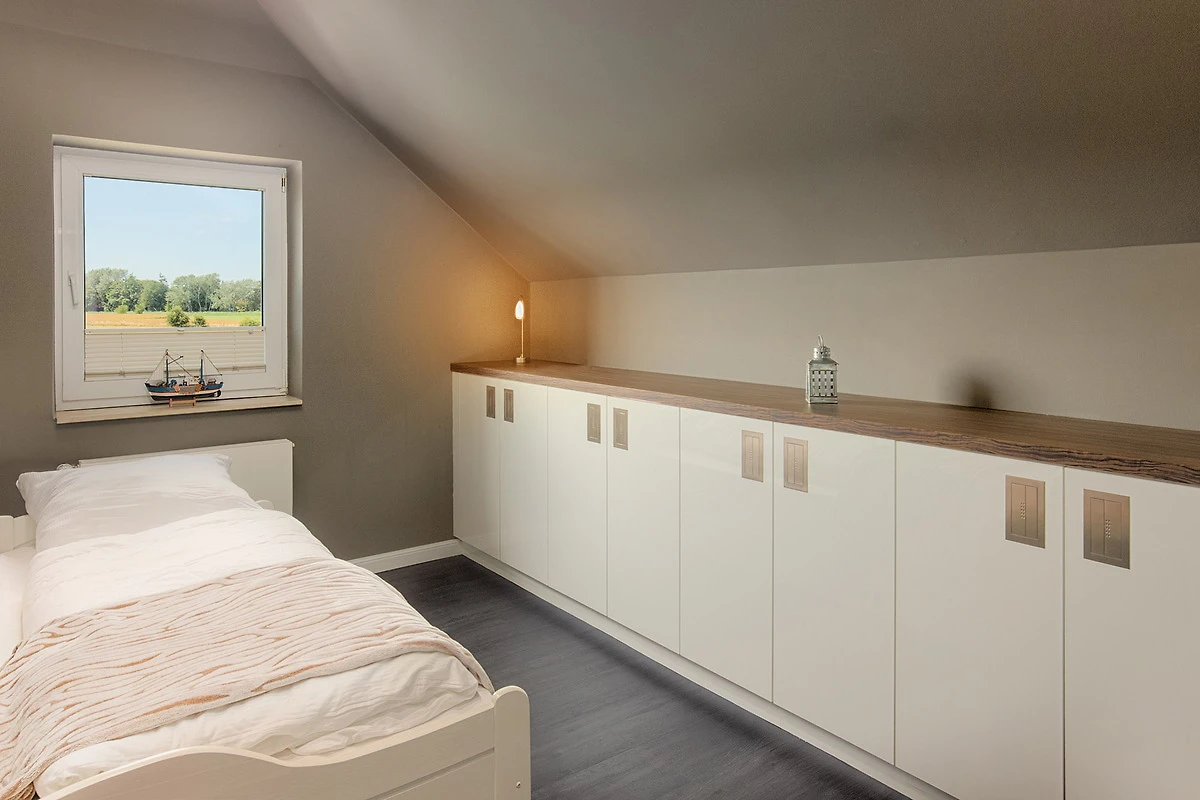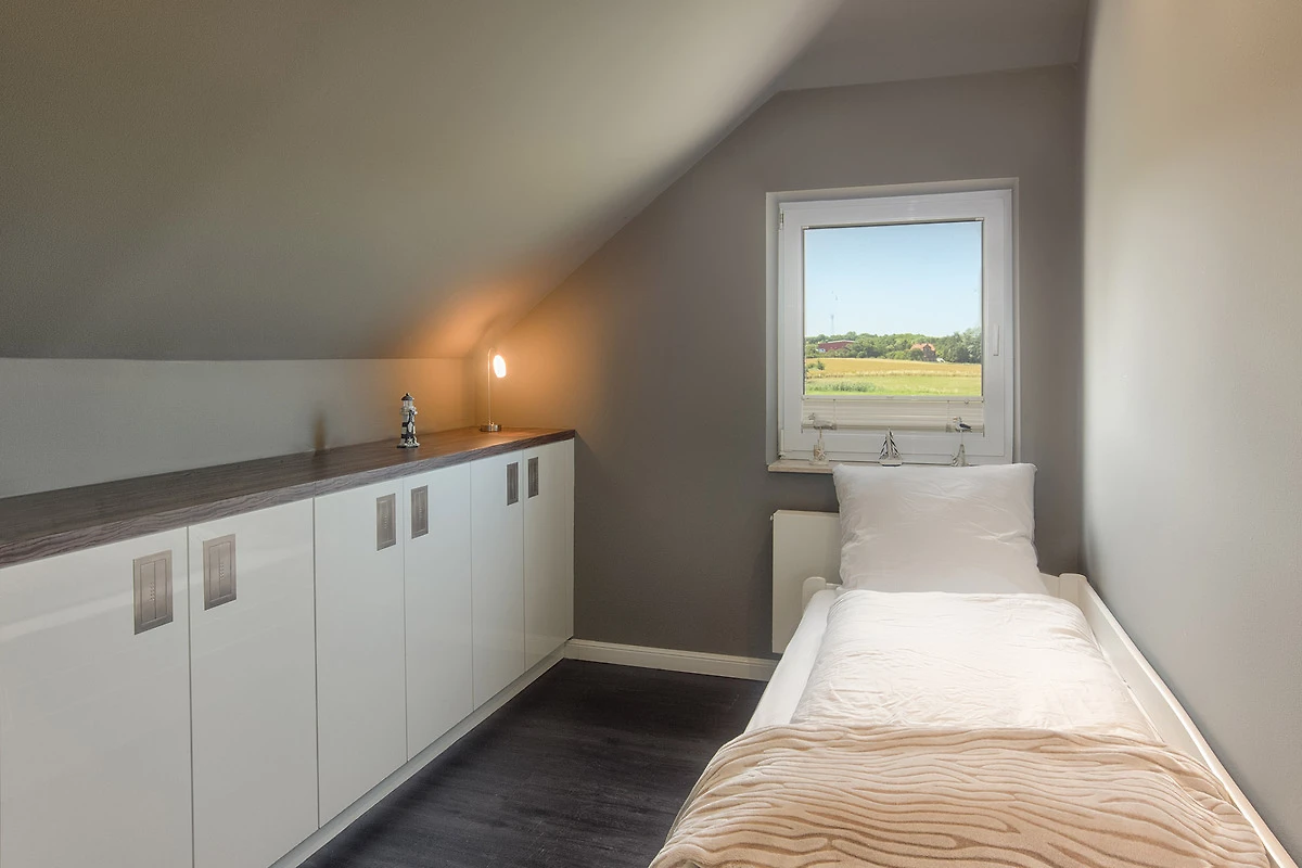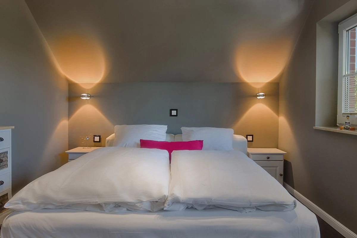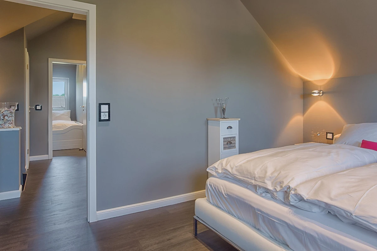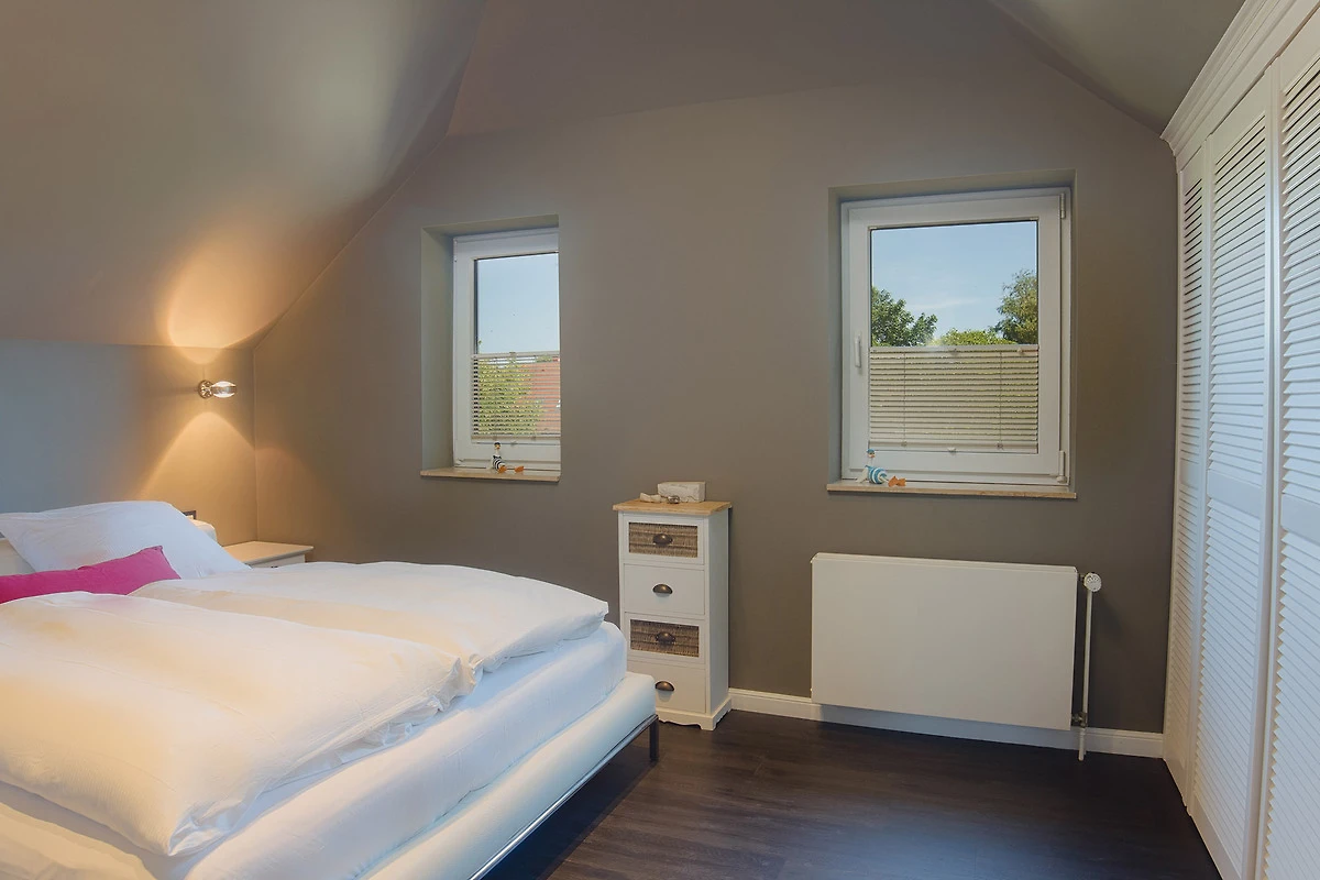 Ebenso komfortabel geht es in den drei Schlafzimmern der Unterkunft im 1. Obergeschoss weiter. Hier wartet ein einladendes Doppelbett (180x200), sowie in den kleineren Schlafzimmern (mit TV) jeweils Einzelbetten (90x200), eines davon mit Ausziehfunktion, z.B. als zusätzliches Kinderbett. Grosse Kleider- oder Einbauschränke bieten ausreichend Stauraum. Für Verdunklung sorgen Jalousien.