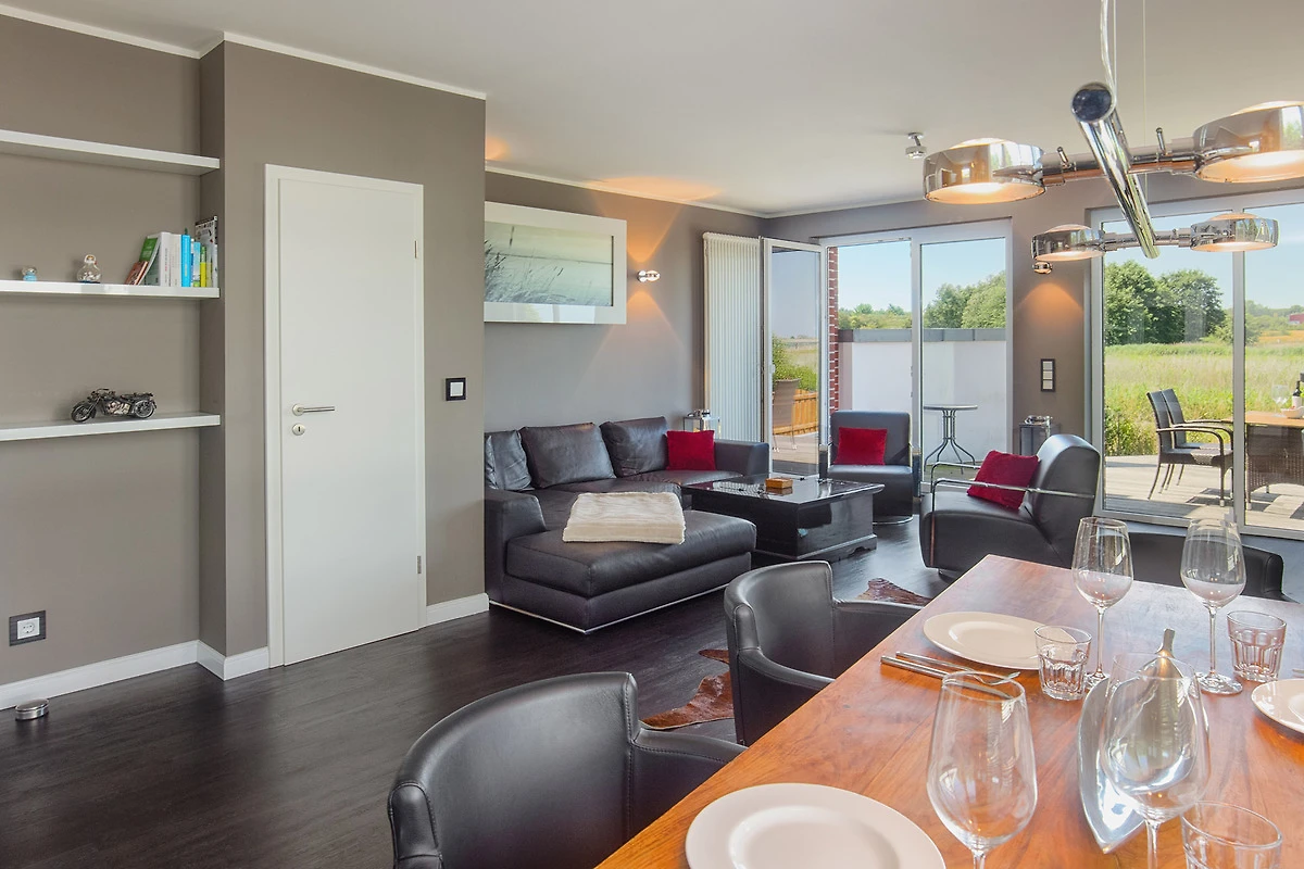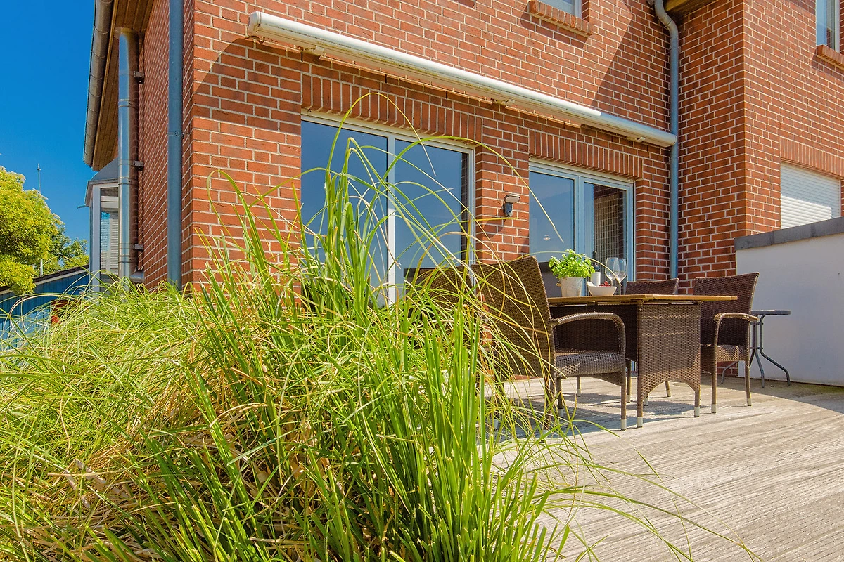 Die möblierte Terrasse schliesst direkt an den Wohnbereich an. Westseitig mit Blick auf die Ostsee und die Salzwiese. Diese lädt dazu ein, den Tag mit einer Tasse Kaffee an der frischen Seeluft zu beginnen oder laue Sommerabende entspannt ausklingen zu lassen.