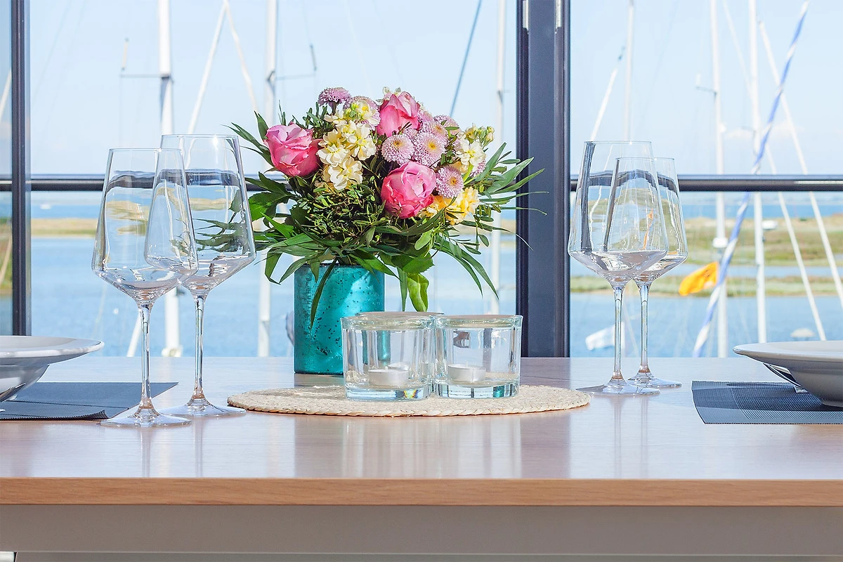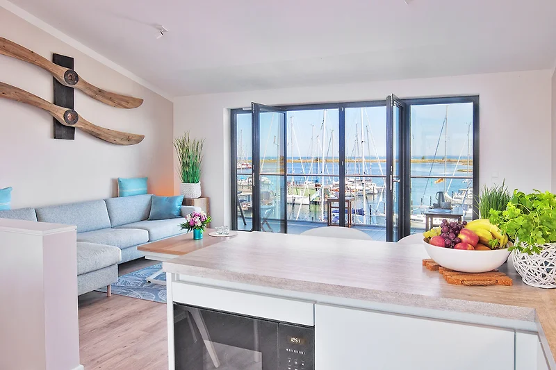 Direkt an den Wohnbereich grenzt die offene, voll ausgestattete Küche, die Hobbyköche begeistert. Der elegante Essbereich mit zusätzlichen Sitzgelegenheiten an der Kücheninsel schafft ein geselliges Ambiente – und das bei herrlichem Blick auf das Wasser. Ein besonderer Clou ist der raffinierte Couchtisch, der sich in eine Esstafel verwandeln lässt – ein einzigartiges Erlebnis für gemeinsame Mahlzeiten!