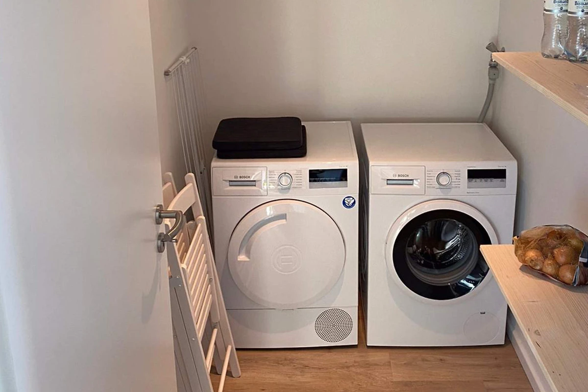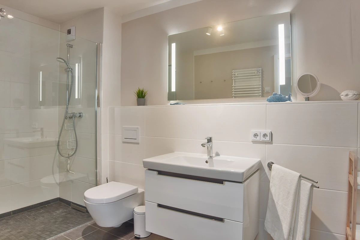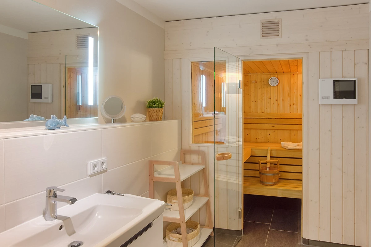 Nach einem aktiven Tag an der Ostsee bietet das luxuriöse Badezimmer mit ebenerdiger Dusche und integrierter Sauna wohltuende Entspannung. Zusätzlich stehen eine Waschmaschine und ein Trockner in einem separaten Raum zur Verfügung.