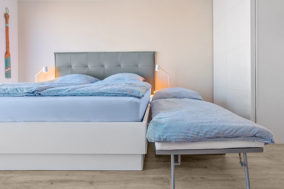 Die stilvolle Ferienwohnung bietet Platz für bis zu vier Personen. Das separate Schlafzimmer im ersten Obergeschoss ist mit einem modernen Doppelboxspringbett und einem wandelbaren Schlafhocker ausgestattet. Im grosszügigen Wohnbereich lädt eine komfortable Schlafcouch (160x200 cm) zum Entspannen ein. Die hochwertige Ausstattung mit Smart-TV, WLAN, Playstation, Bluetooth-Soundbox und einer kleinen Bibliothek lässt in puncto Unterhaltung keine Wünsche offen.