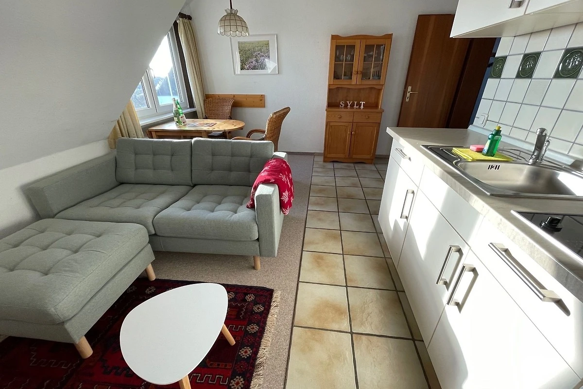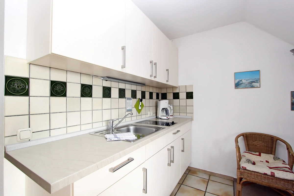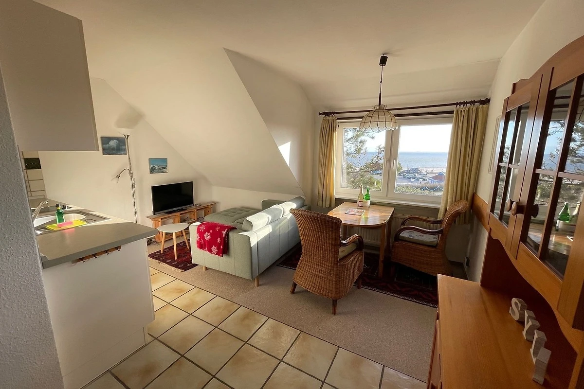 Diese kleine Ferienwohnung für zwei Personen im Haus Meerblick hat zwei getrennte Zimmer, davon ein neues Schlafzimmer mit Boxspringbett, und ein Wohnzimmer mit Küchenzeile.
