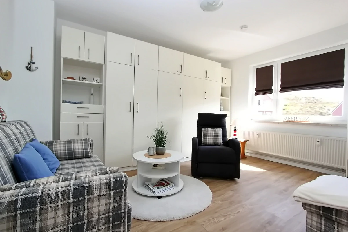 modernes 1 Zimmer Appartement mit ca. 31 m² unweit des Hörnumer Golfplatzes im Herzen von Sylt`s sonnigen Süden; 1 Wohn-/Schlafraum mit Doppelschrankbett, 2 Sitzer-Couch, gemütlicher Sessel, Tisch, Schrank und SAT-Flat-TV. Die neue separate Küche verfügt über ein 4 Platten Cerankochfeld, Backofen, Geschirrspüler, Kühlschrank, Essplatz für 2 Personen, sowie alle Utensilien, die Sie benötigen, um sich selbst zu versorgen. Neues Duschbad/WC; Flur mit Garderobe.