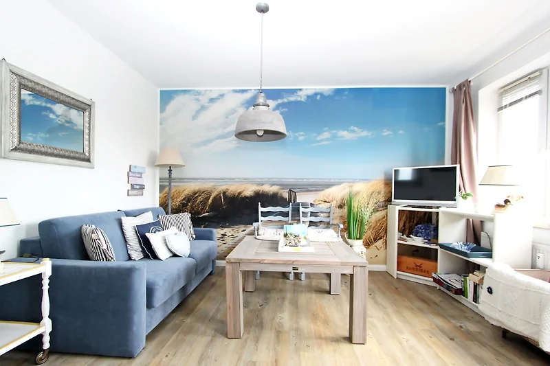 Die kleine Einbauküche verfügt über ein Cerankochfeld, Mikrowelle mit Grillfunktion, Kühlschrank mit kleinem Gefrierfach und allen Utensilien, die Sie benötigen, um sich selbst zu versorgen. An einem Esstisch mit zwei Stühlen können Sie Ihre Mahlzeiten einnehmen. Der Flur ist mit einer Garderobe und einem grossen Einbauschrank eingerichtet, der genug Stauraum bietet. Von dort gelangen Sie in das Duschbad mit WC. Im kompletten Appartement wurde Designfussbodenbelag verlegt. Viele, aufeinander abgestimmte, maritime Accessoires runden das Gesamtbild ab. Ein PKW-Stellplatz (Nr. 21) vor dem Haus gehört ebenfalls dazu. Sie haben im Wirtschaftsraum die Möglichkeit, Ihre Wäsche zu waschen und ggf. zu trockenen (mit Münzzähler).