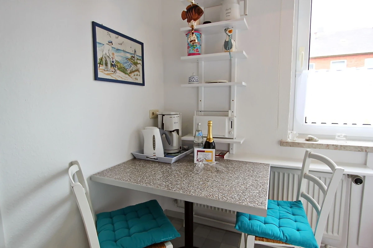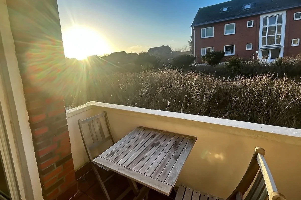 gepflegtes 1 Zimmer Appartement mit ca. 31m² unweit des Hörnumer Golfplatzes; ein Wohn-Schlafraum mit Doppelbett, zwei Korbsessel, Zweisitzercouch, Tisch, Truhe, Sideboard, Sat-TV, Radiowecker, Zugang zum Westbalkon mit Bestuhlung; kleine separate Küche mit Zweiplattencerankochfeld, Mikrowelle- und Backofenkombination sowie einem Kühlschrank mit kleinem Gefrierfach; Esstisch für 2 Personen; Flur mit Kleiderschrank und Abstellkammer; DuschbadWC. Seit Februar 2026 verfügt das Appartement über W-Lan.
