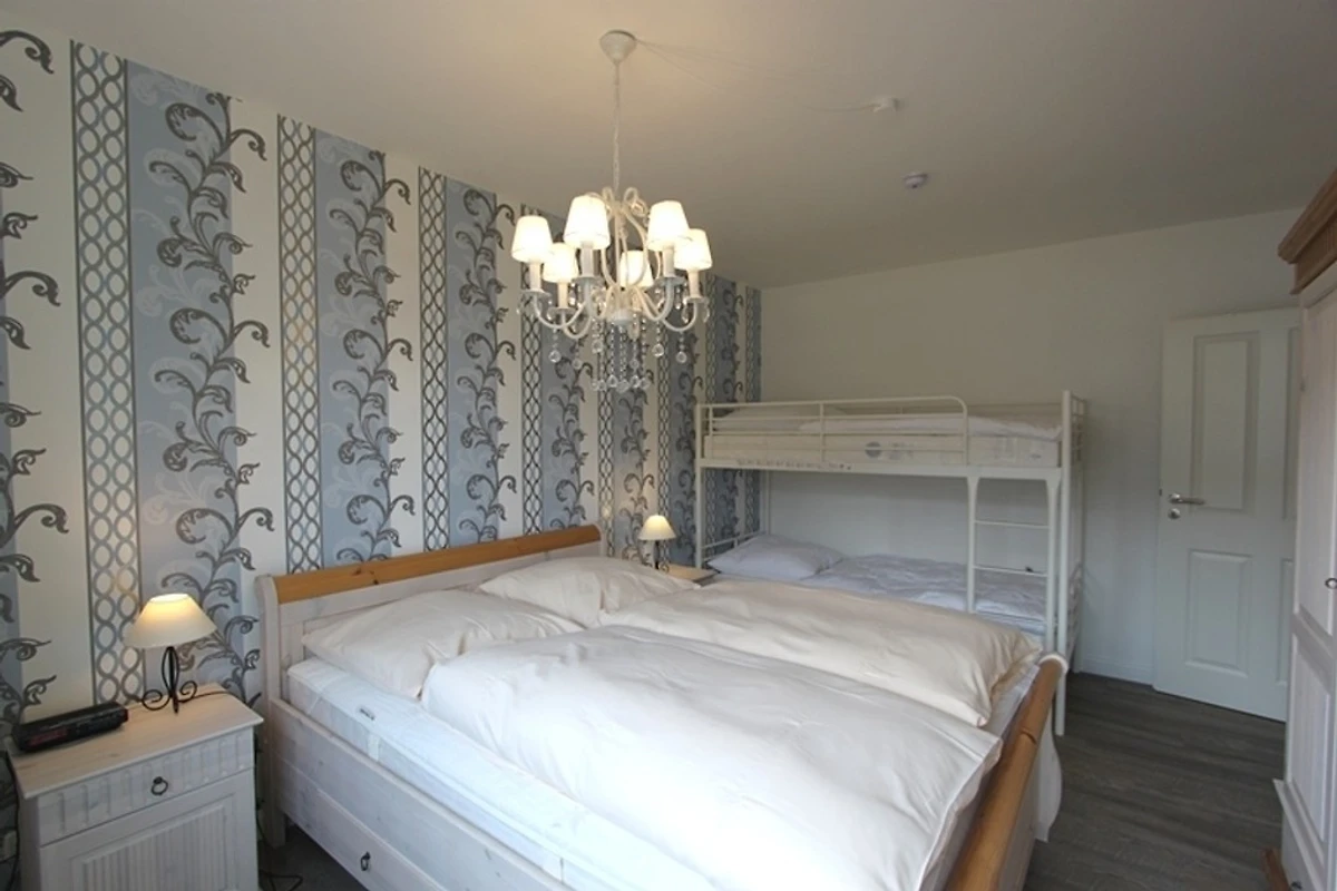 Herzstück der Wohnung ist der ca. 25 m² grosse Wohn-Essbereich mit gemütlichen Sofas, Ohrensessel und Echtholz-Mobiliar, 3D-HD-TV mit SAT-Empfang und grosser Esstisch. Sie geniessen von hier aus den Dünenblick und den ganzen Tag die Sonne auf dem Süd-Westbalkon. Übernachten Sie in ruhigen und geschmackvoll eingerichteten Schlafräumen (ca. 15 und 18m²) auf 180 bzw. 160cm breiten Betten im Landhausstil und Verdunkelungs-Rollos. Das grosse Zimmer verfügt zusätzlich über ein stabiles Etagenbett (200 x 90cm) und SAT-TV. Alle Schlafplätze inkl. des Etagenbetts verfügen über sehr hochwertige, feste, neue Matratzen, sowie ein zusätzliches Hauck-Babybett für unsere kleinsten Gäste. Das moderne Bad ist mit Glasdusche und Handtuchwärmer ausgestattet.